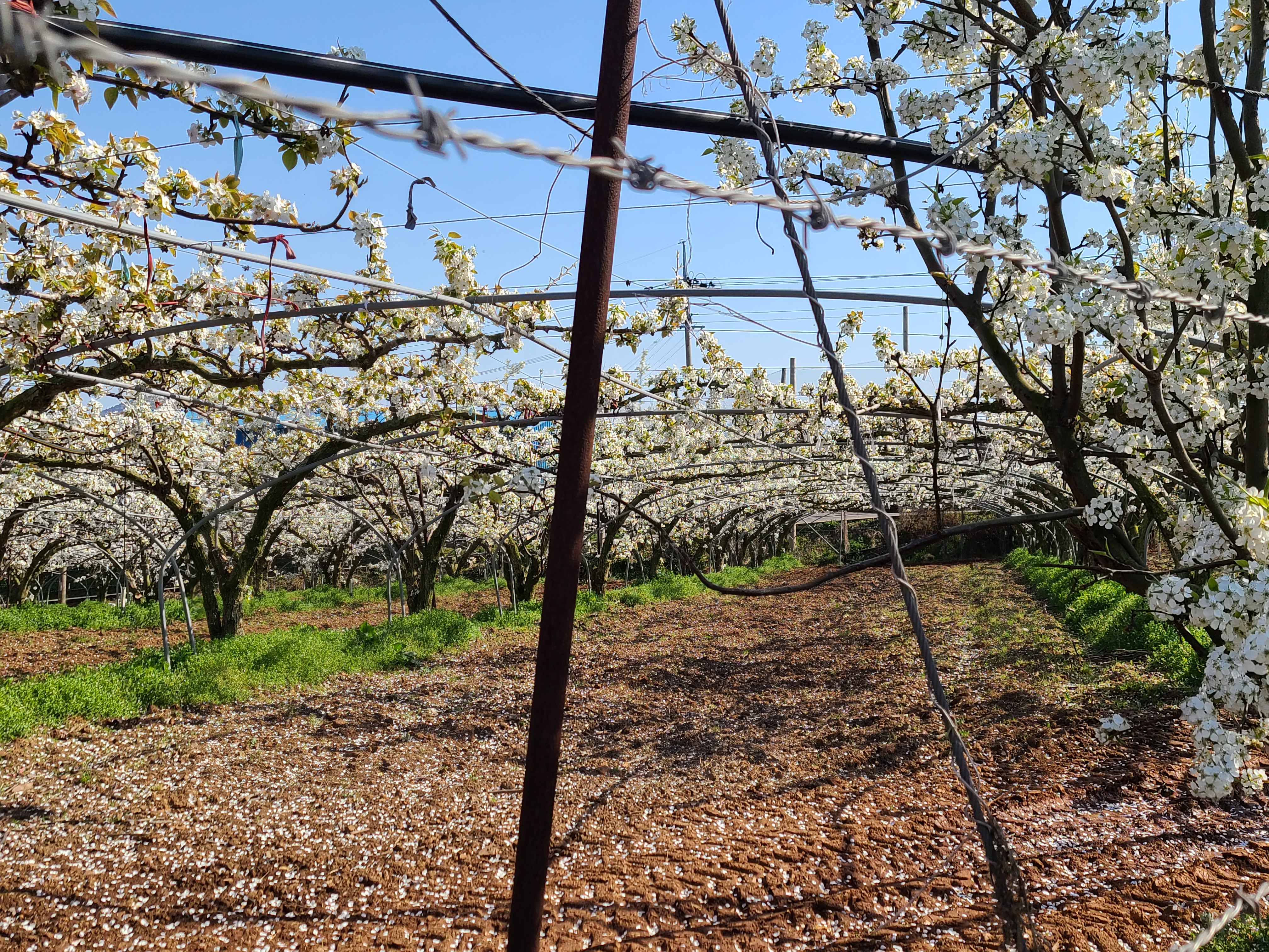 어느새 배꽃도 벚꽃처럼 바람에 하나둘 떨어지고 있다. 베 과수원 바닥에 하얀 배꽃 잎이 떨어져 있다.