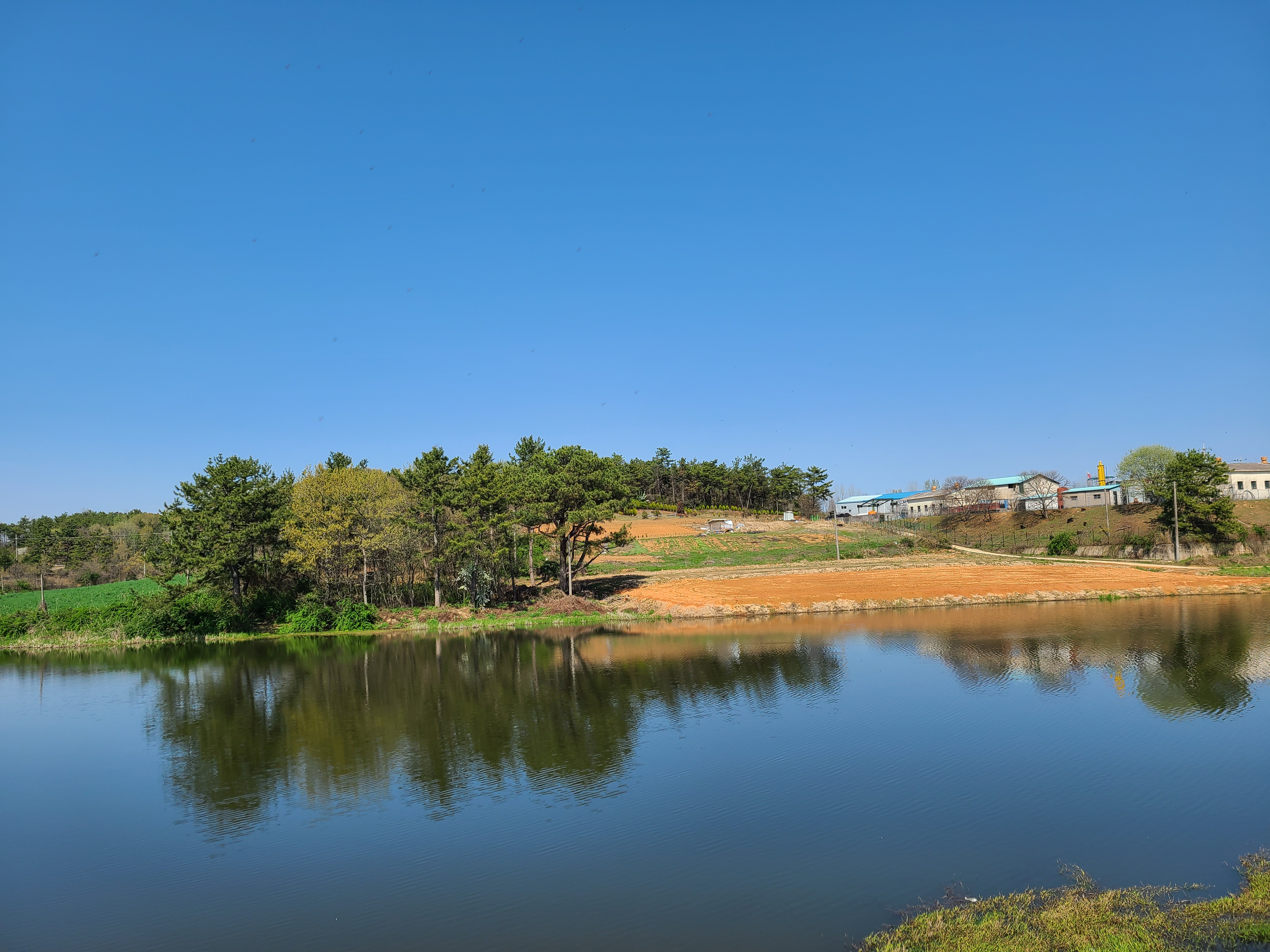 주말에 비가 오고 나더니 오늘 날씨는 너무 맑고 좋다. 산책을 나섰는데 저수지 주변 풍경이 한 폭의 그림 같다.