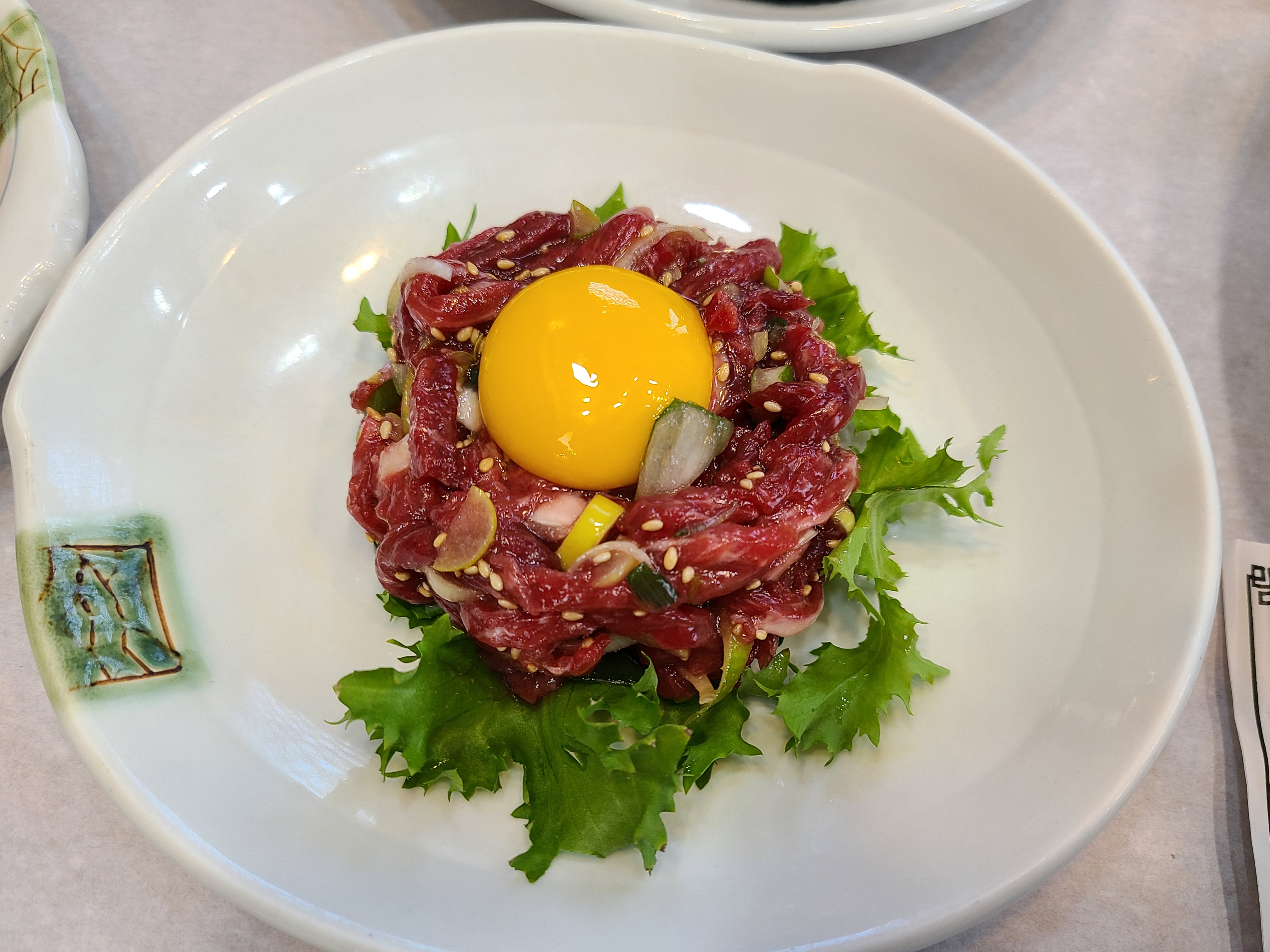 드디어 주문한 정이품 한상이 차려져 나왔다. 육회와 광어회를 비롯하여 찰밥까지 나왔는데 어느 하나 대충 만든 음식이 없이 모두가 맛깔스러웠다. 호박죽을 먼저 먹은 후 차례차례 맛을 음미하며 먹기 시작했다.