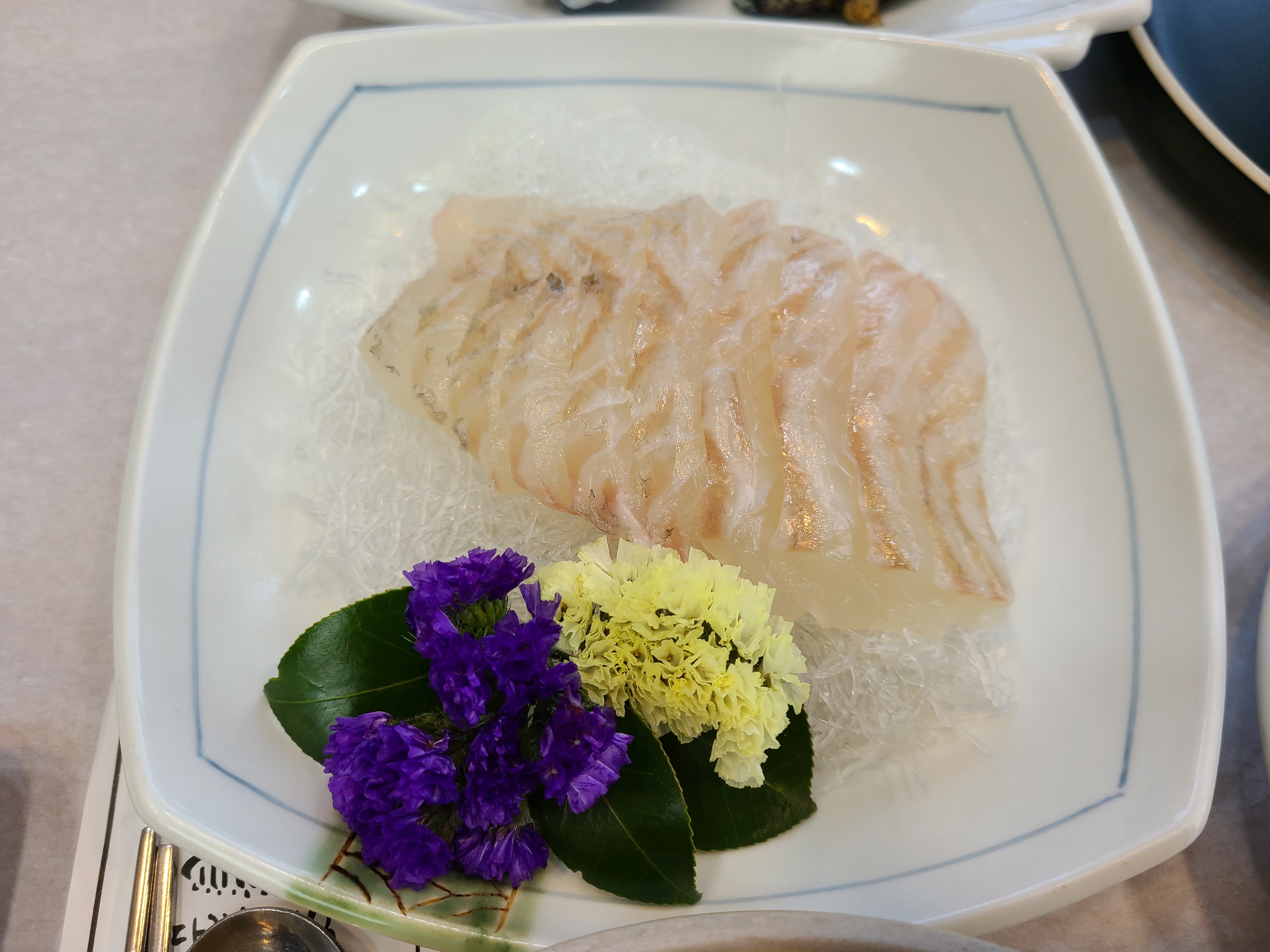 쫀득한 식감의 광어회는 일반 생선횟집에 뒤지지 않는 맛이다.