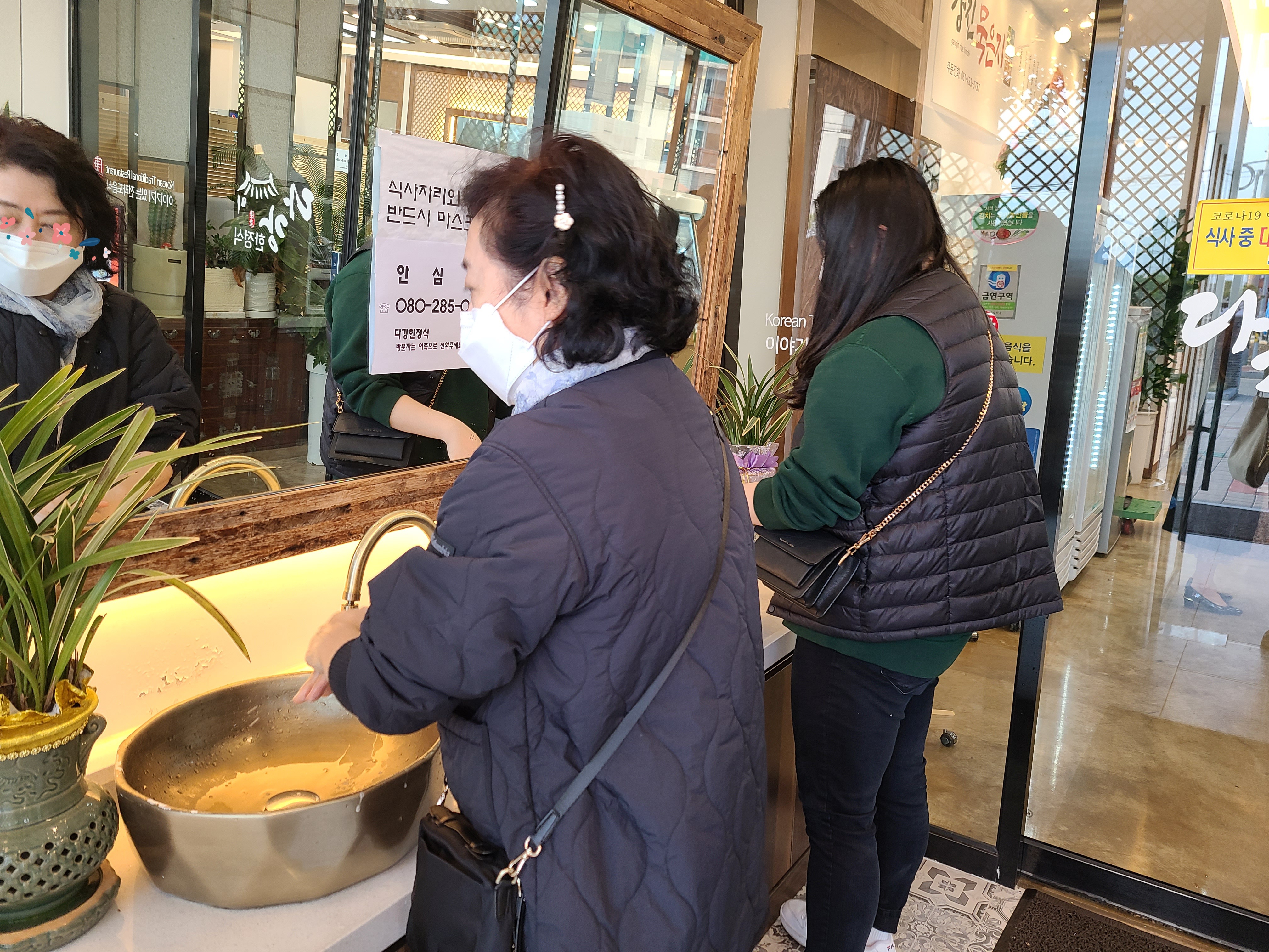 다강 한정식은 예전에 있던 곳에서 지금의 자리로 신축해서 옮겨왔다고 한다. 음식점 입구에 손을 씻을 수 있게 세면대가 설치되어 있어 너무 좋았다.