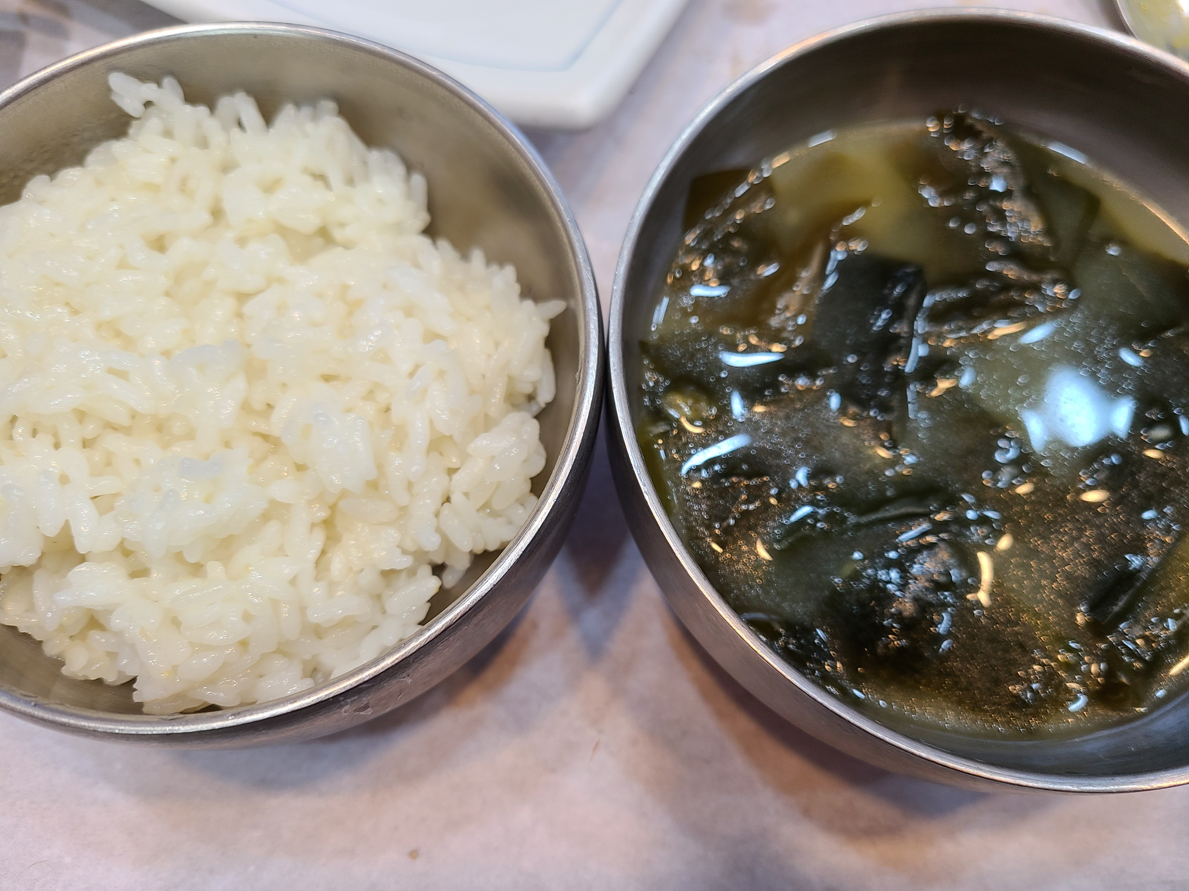 기름기가 흐르는 쌀밥과 북어채와 미역을 참기름에 볶아 푹 끓여낸 미역국도 일품이다.
