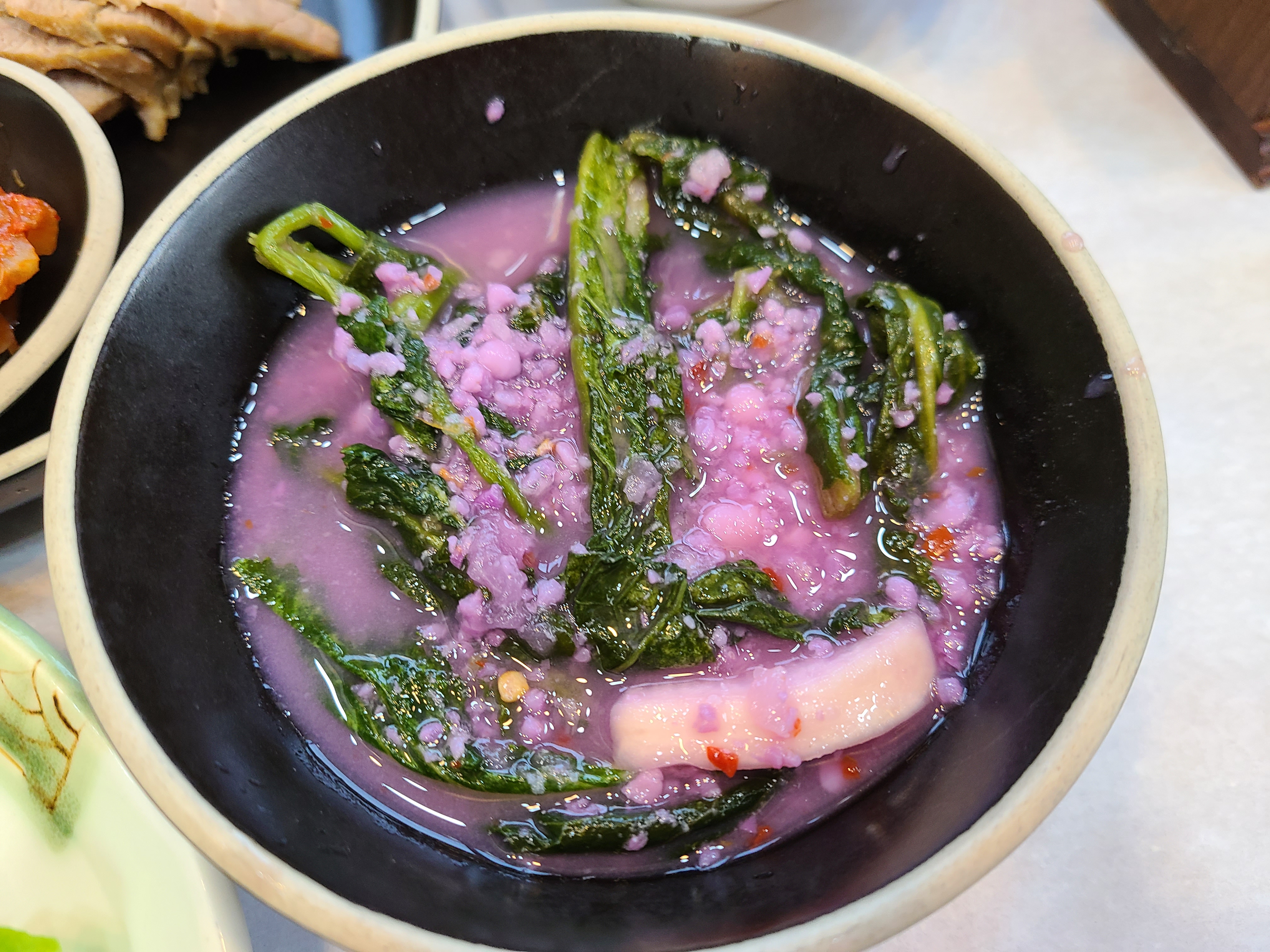 갓 물김치에 밥알이 씹히는데 국물이 맵지 않고 구수하면서도 시원하다.