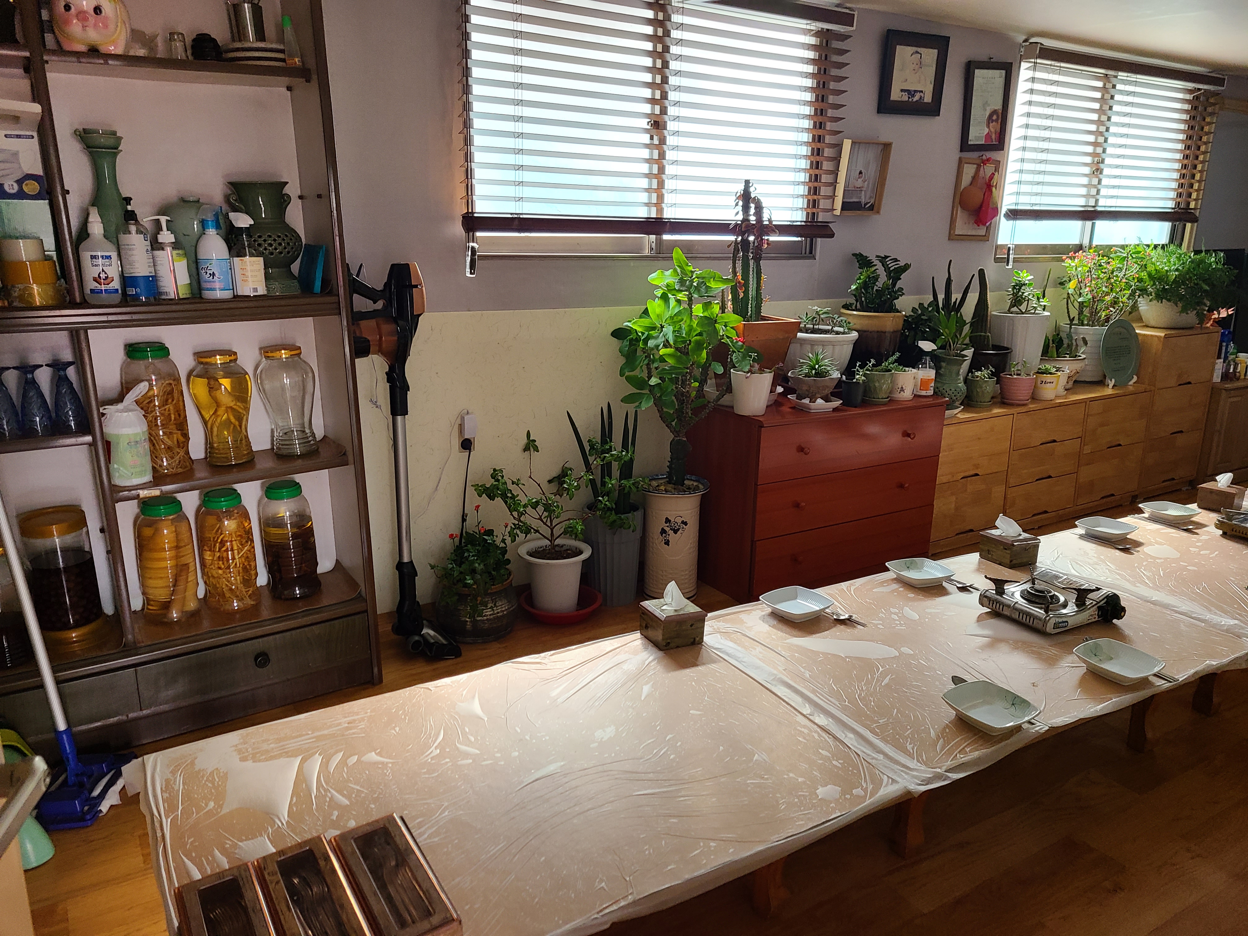 우리는 오른쪽 방으로 들어갔다. 바지락 회무침 소자를 주문했다. 식탁에 놓인 물병에 시원한 옥수수 물이 담겨 있는데 오랜만에 마셔보는 옥수수 끓인 물이 너무 구수하고 맛있었다.