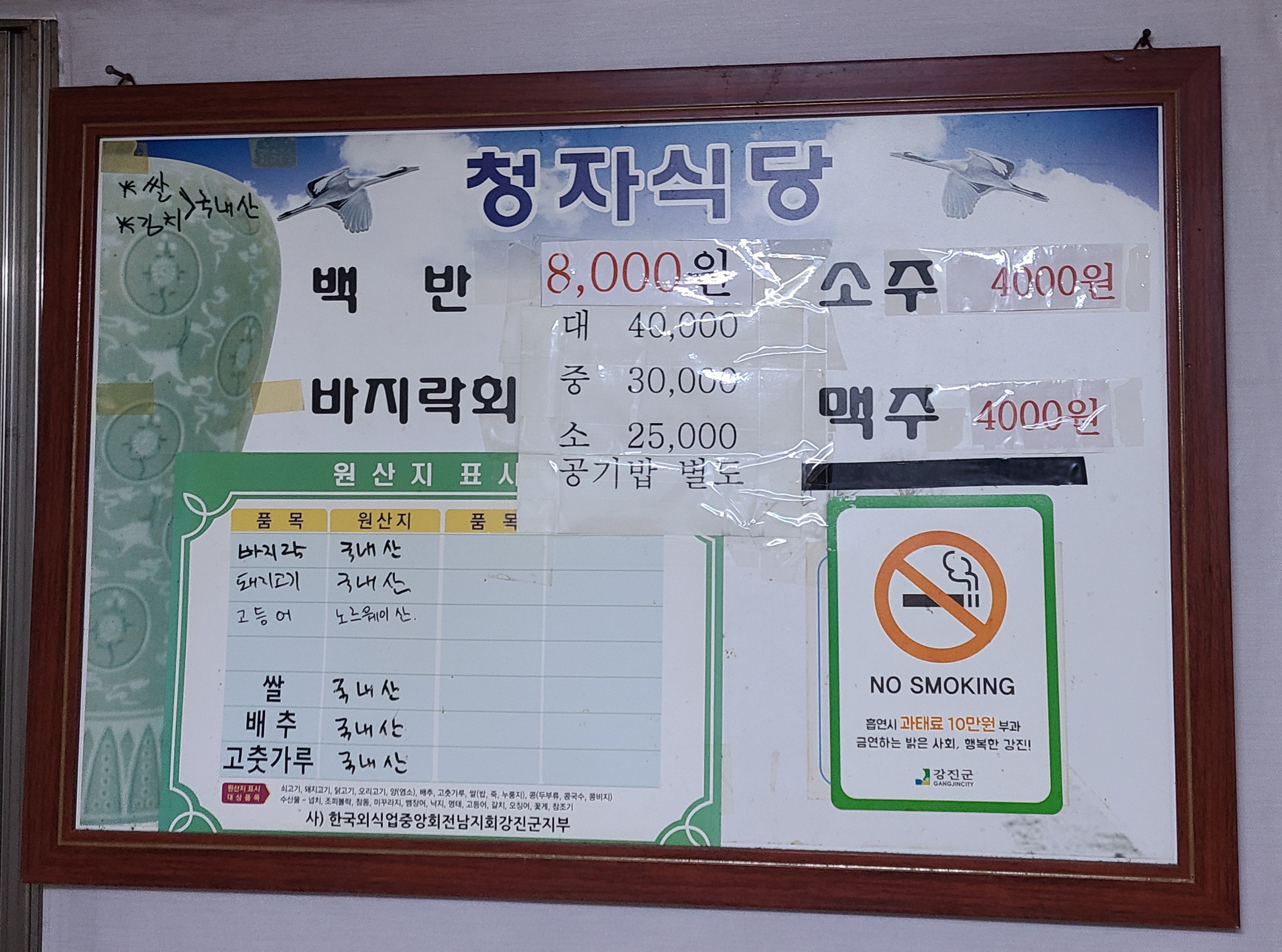 메뉴판에 적혀있는 가격이 처음 방문했을 때 보다 올라 있었다. 백반이 7,000원이었는데 8,000원으로 바지락회 무침 소자 가격이 2,000 원 오른 25,000원이 되어있었다. 지난번 포장을 할 때에는 중짜리를 시켰기에 가격 변화를 몰랐던 것 같다.