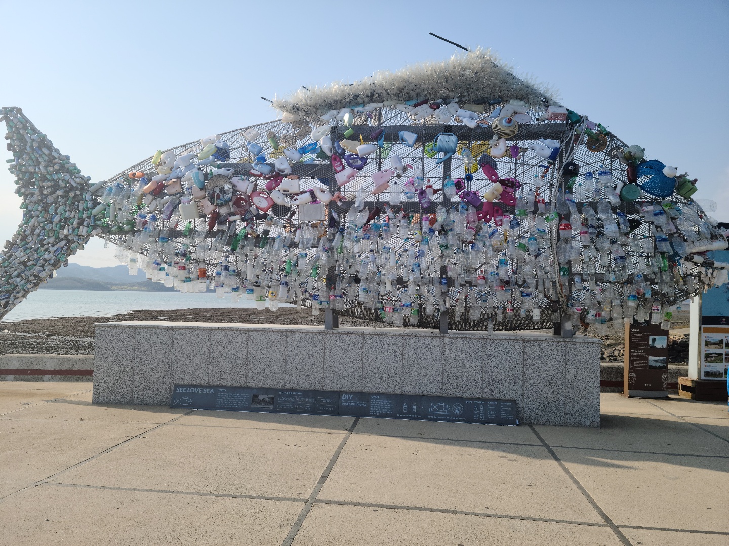 가우도 주차장에 도착하니 유채꽃이 노랗게 피어있고 그위로 짚라인을 타고 내려오는 사람들의 모습이 보였다. 가우도의 상질물인 페트병으로 만든 거대한 물고기를 지나 가우도 출렁다리를 건너 가우도를 한 바퀴 돌아 나왔다.