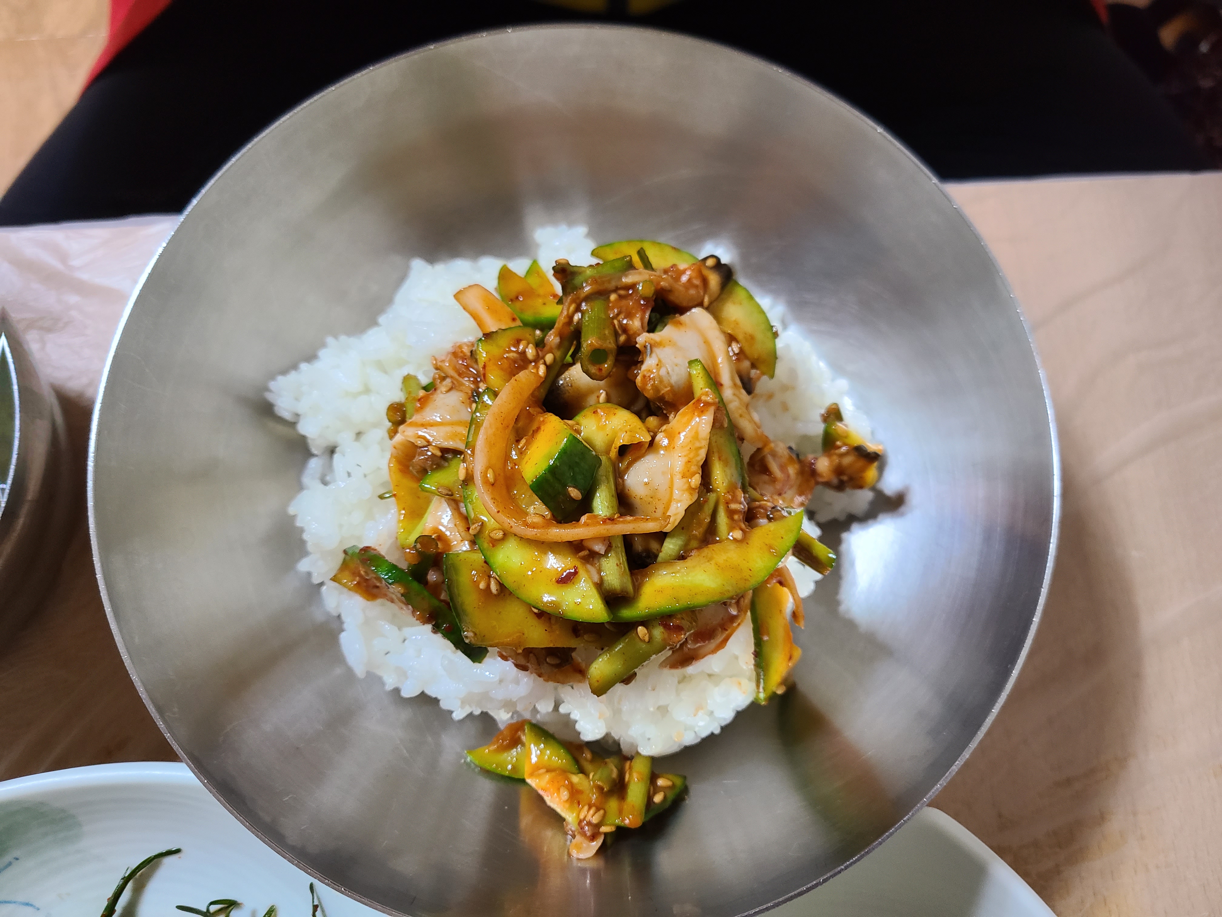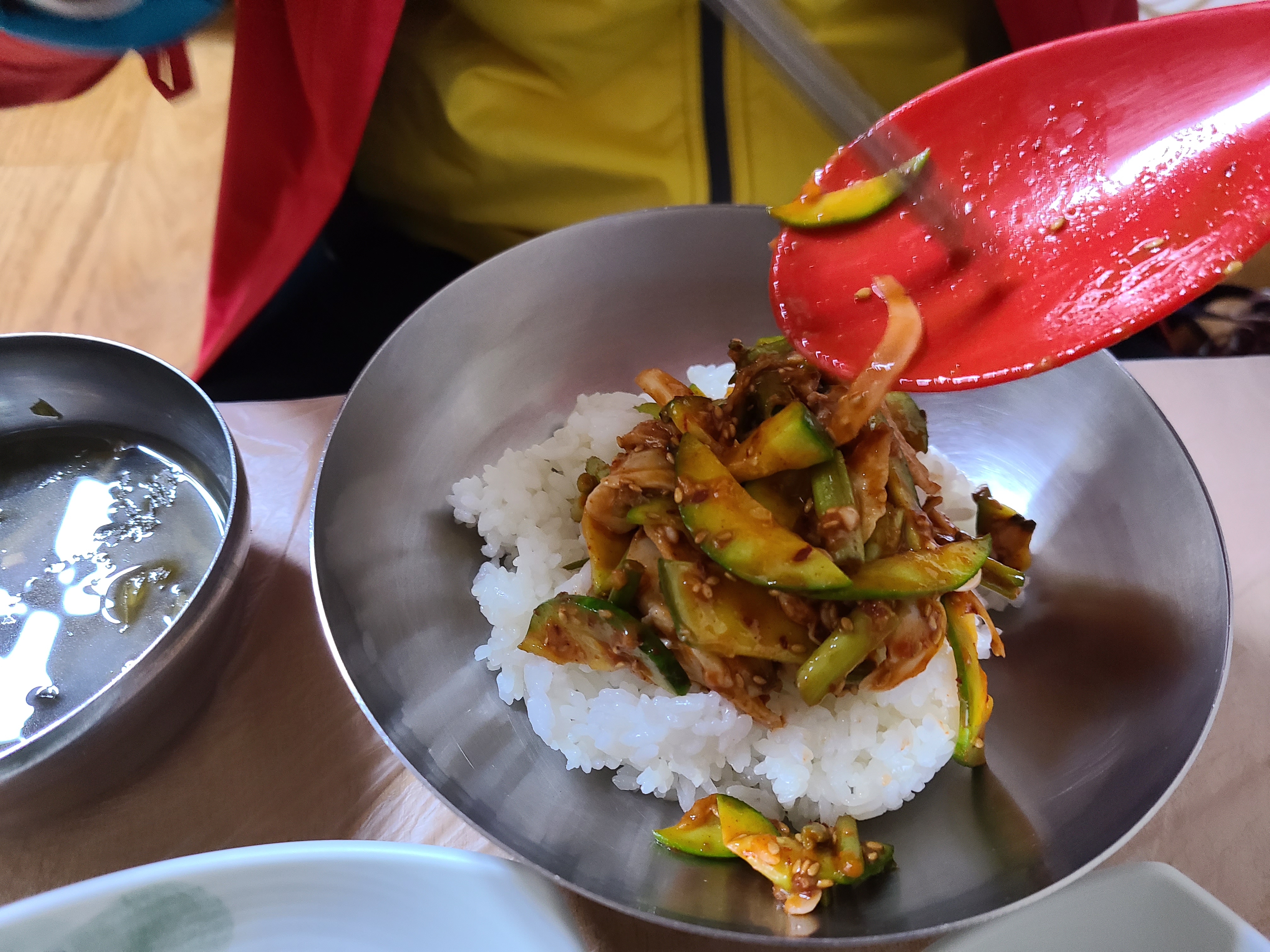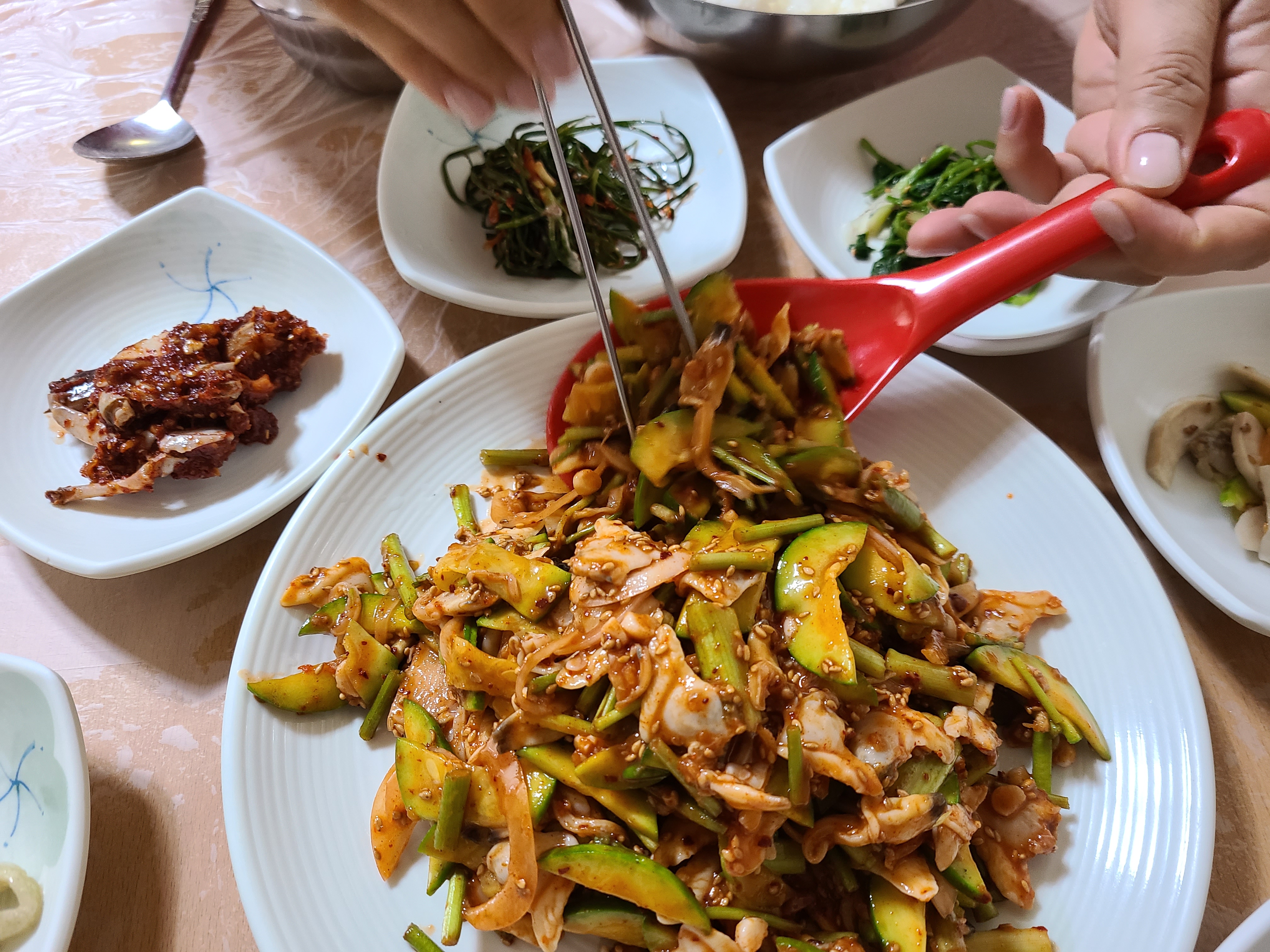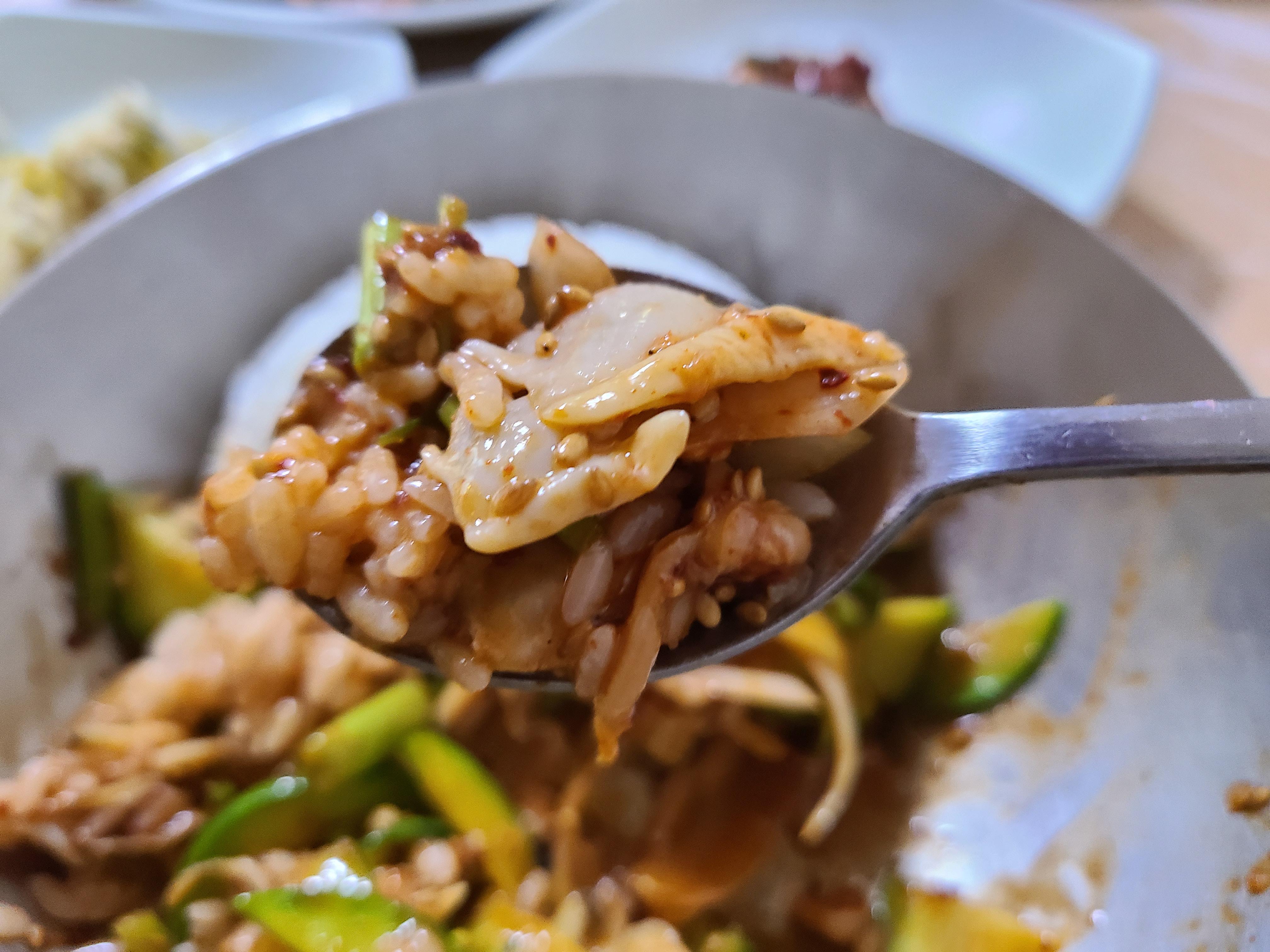 밥 위에 바지락 회무침을 얹고 참기름을 떨궈준 후 쓱쓱 비벼서 한수저를 잎에 넣으니 미나리의 향과 호박의 아삭함 그리고 바지락의 쫀득한 식감이 입안 가득 퍼진다. 매워서 쩔쩔매면서도 너무 맛이 있어서 수저질을 멈출 수가 없었다.