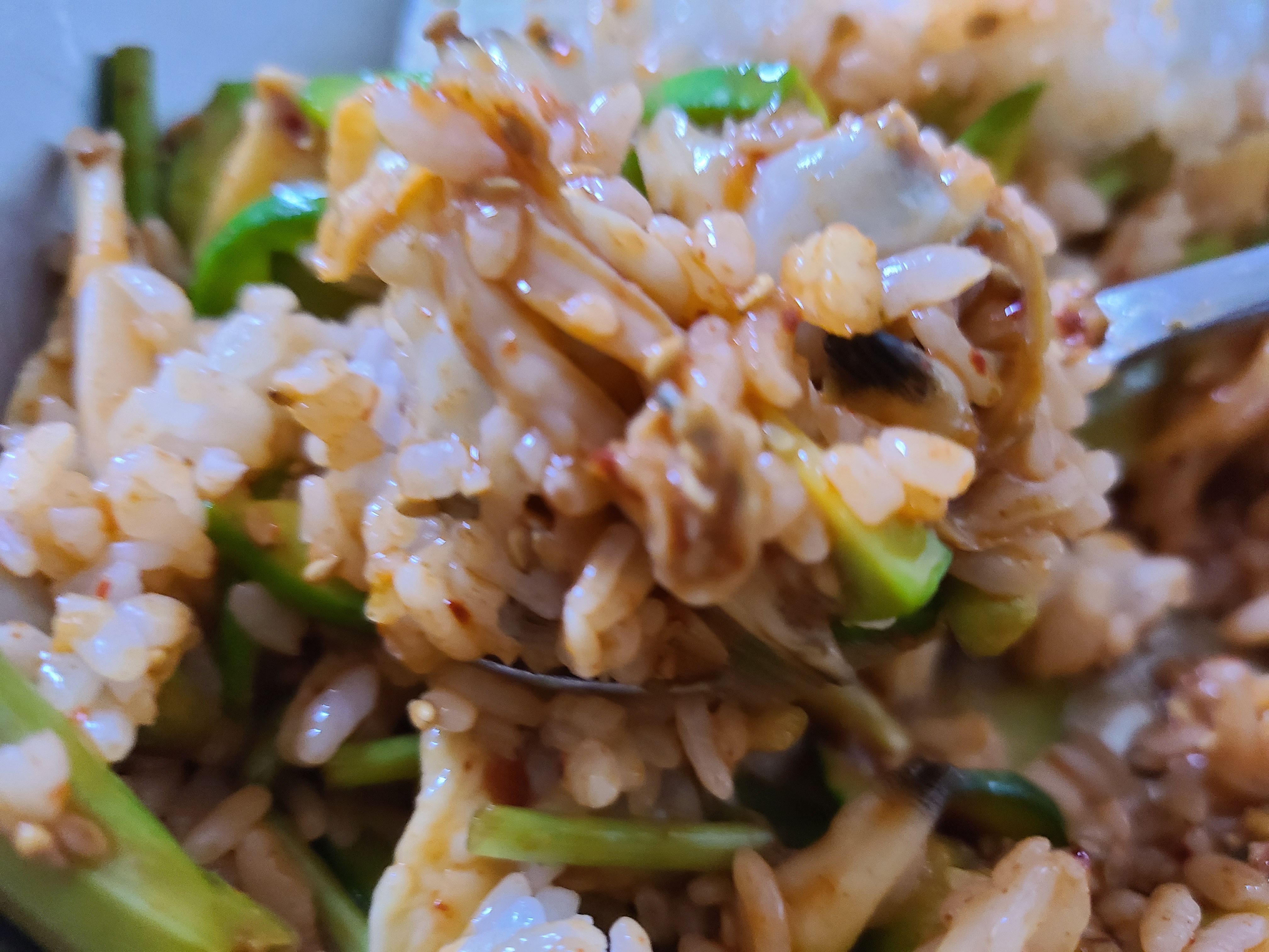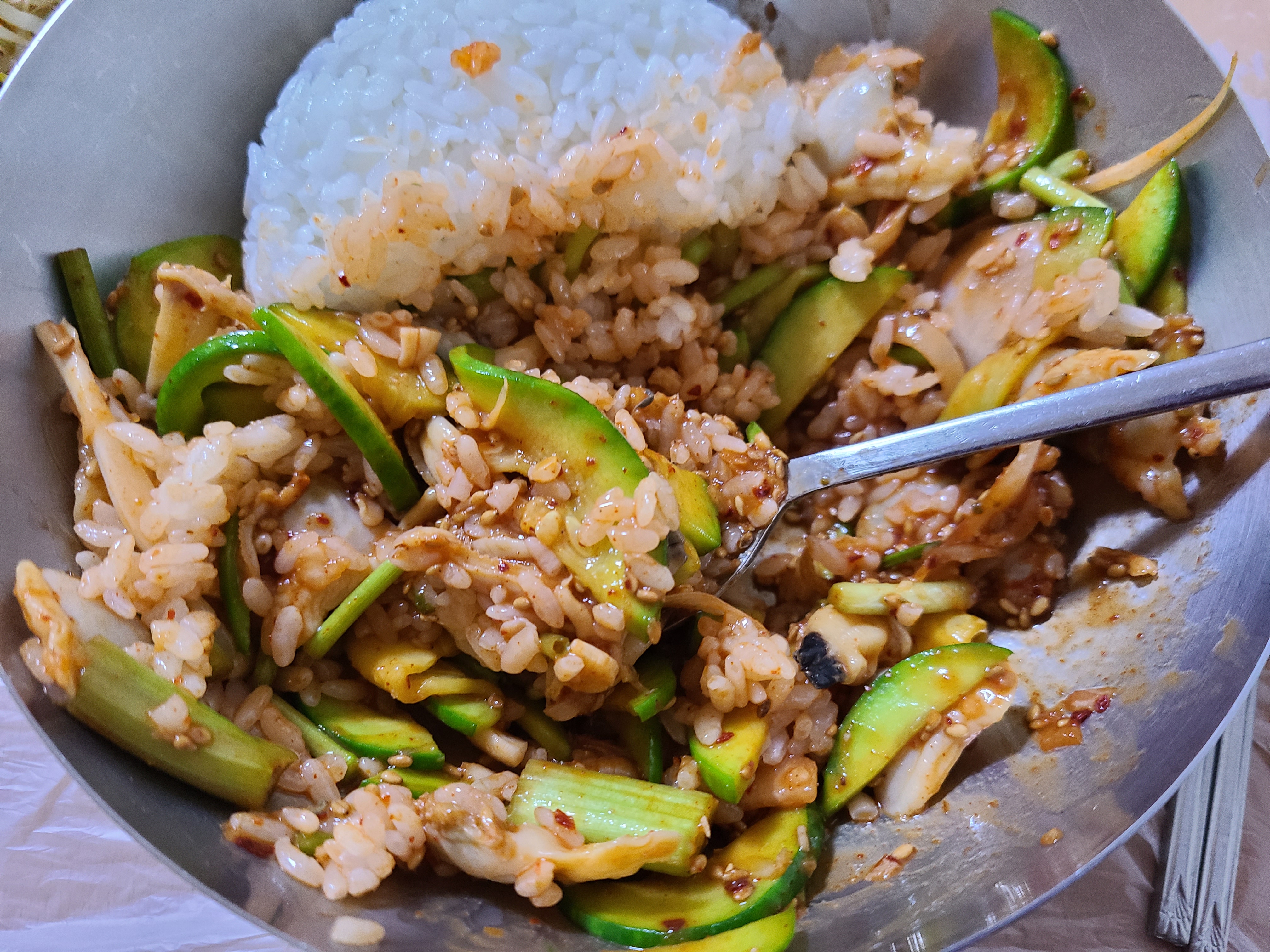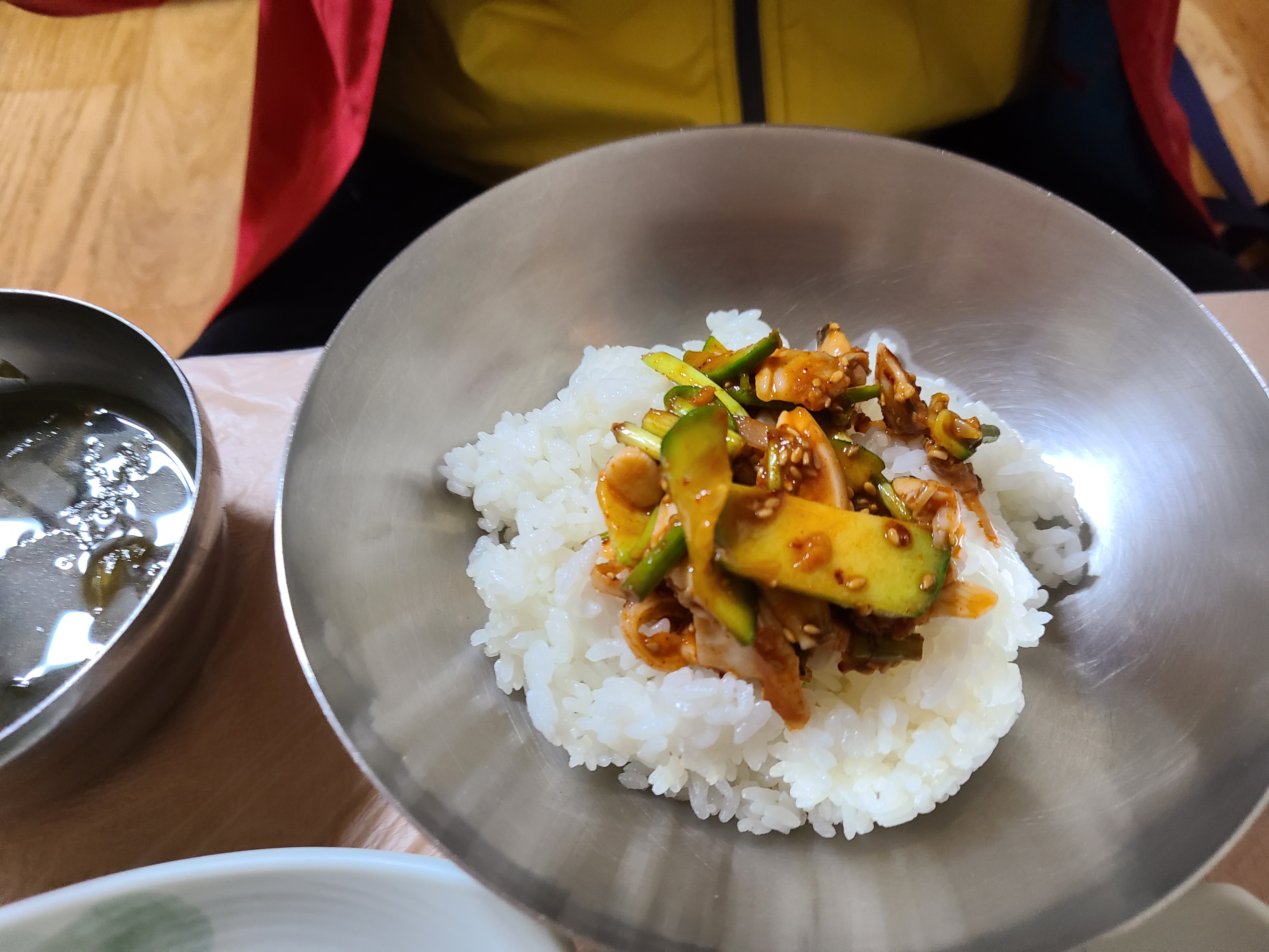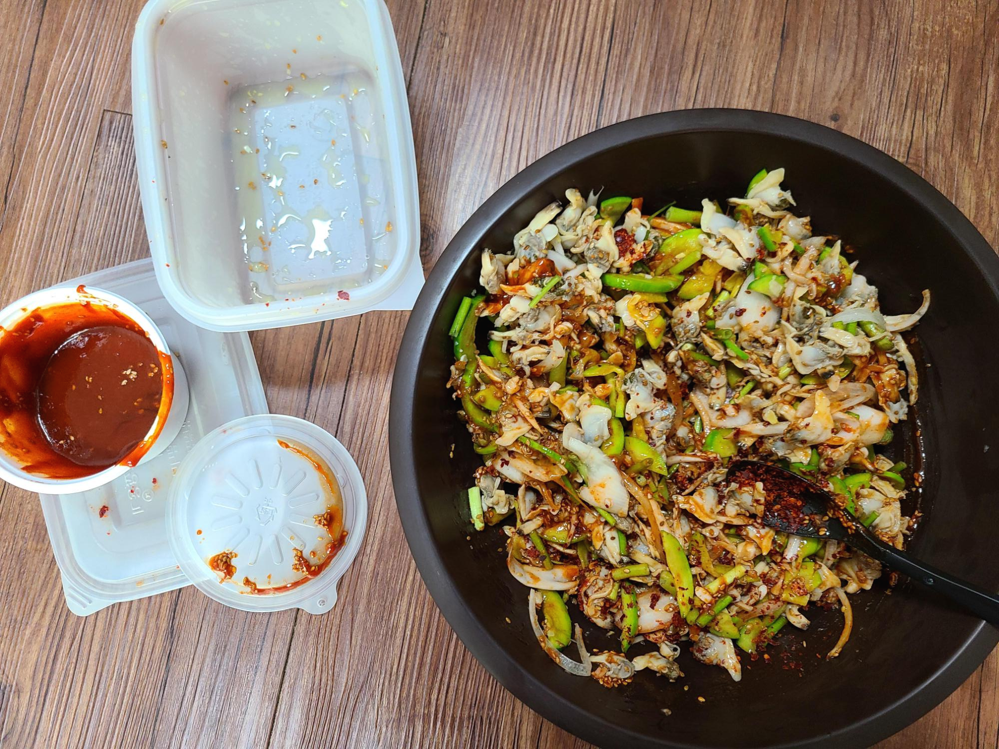 밥 위에 바지락 회무침을 얹고 참기름을 떨궈준 후 쓱쓱 비벼서 한수저를 잎에 넣으니 미나리의 향과 호박의 아삭함 그리고 바지락의 쫀득한 식감이 입안 가득 퍼진다. 매워서 쩔쩔매면서도 너무 맛이 있어서 수저질을 멈출 수가 없었다.