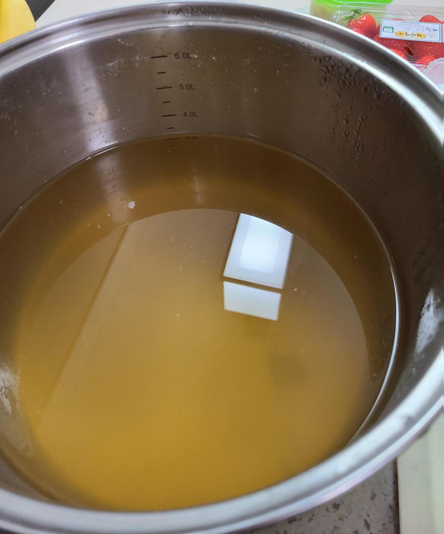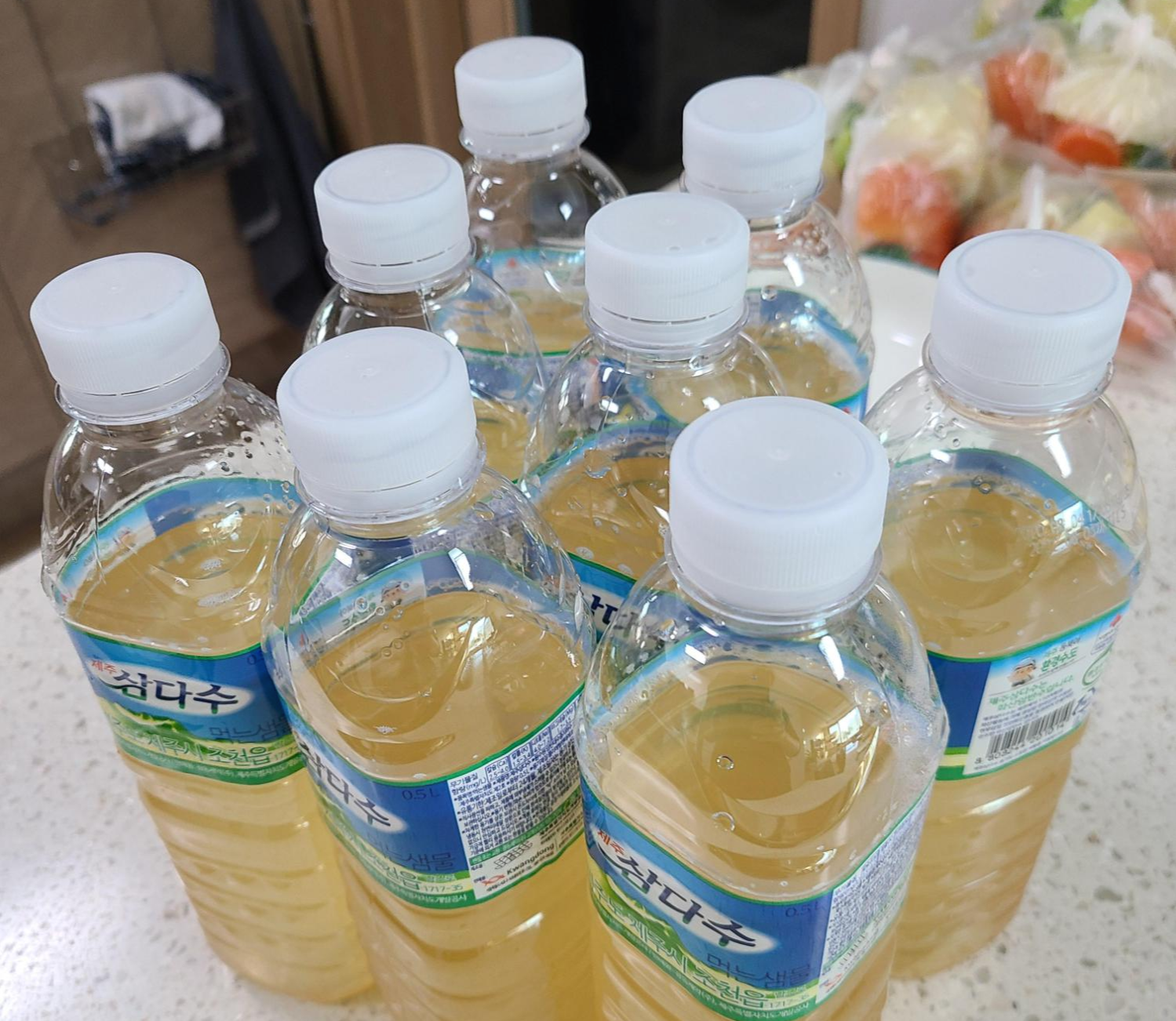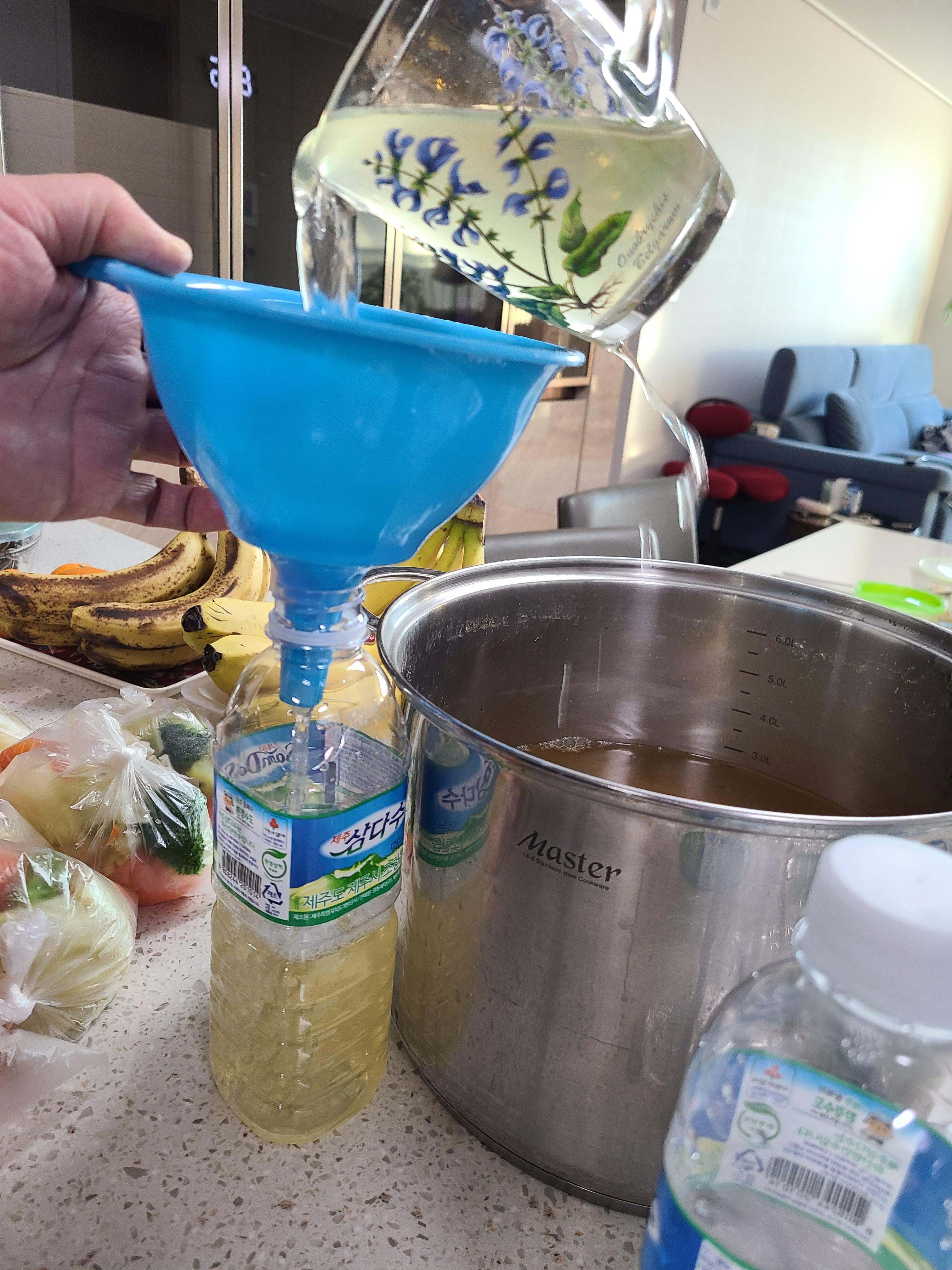 야채를 삶은 물은 식혀서 삶는 물에 사용했던 500ml 생수병에 나누어 담았다.