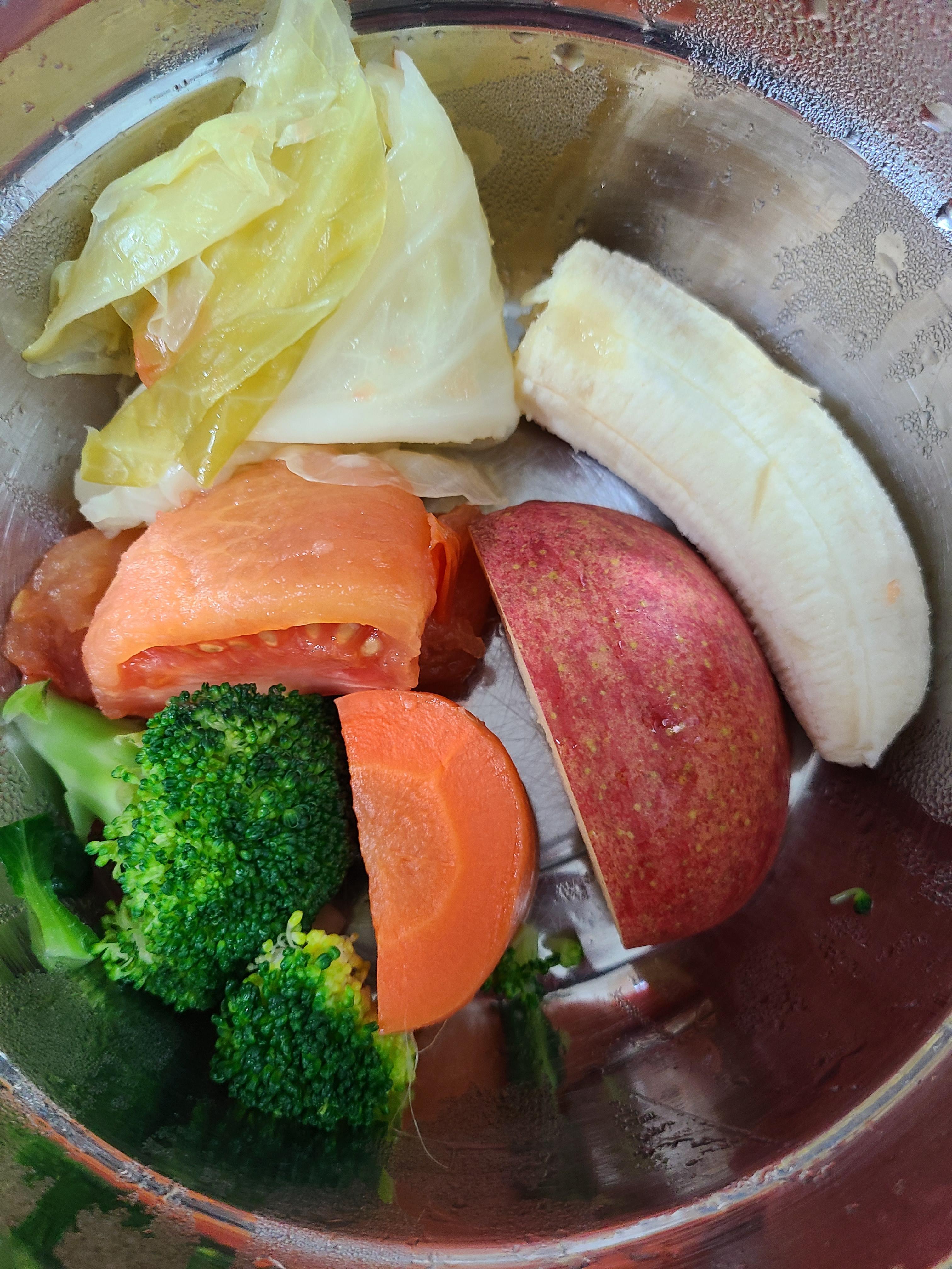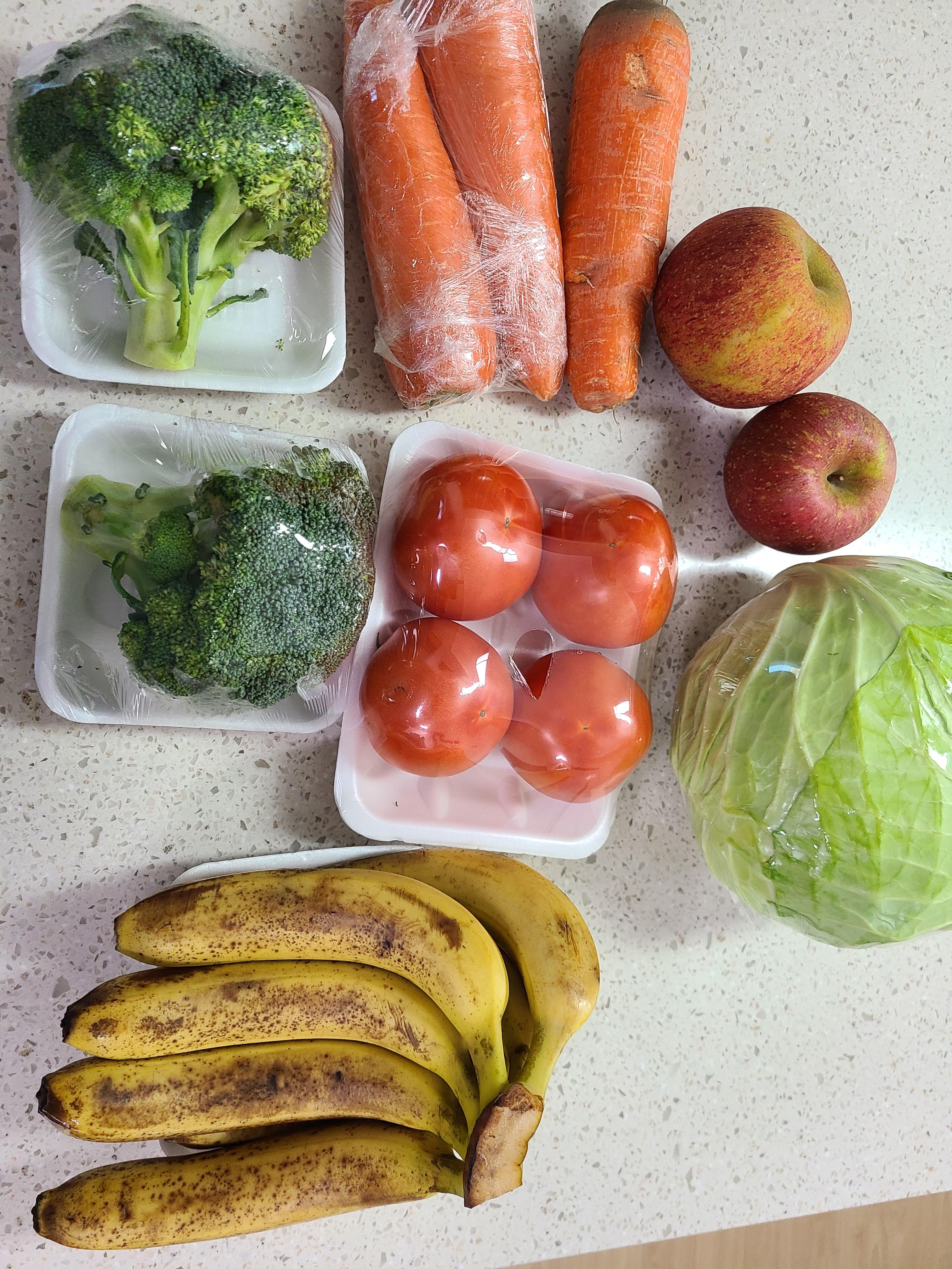 양배추 한 통 브로콜리 2송이 당근 3개 토마토 8개 바나나 한송이 사과 8개를 준비했다.