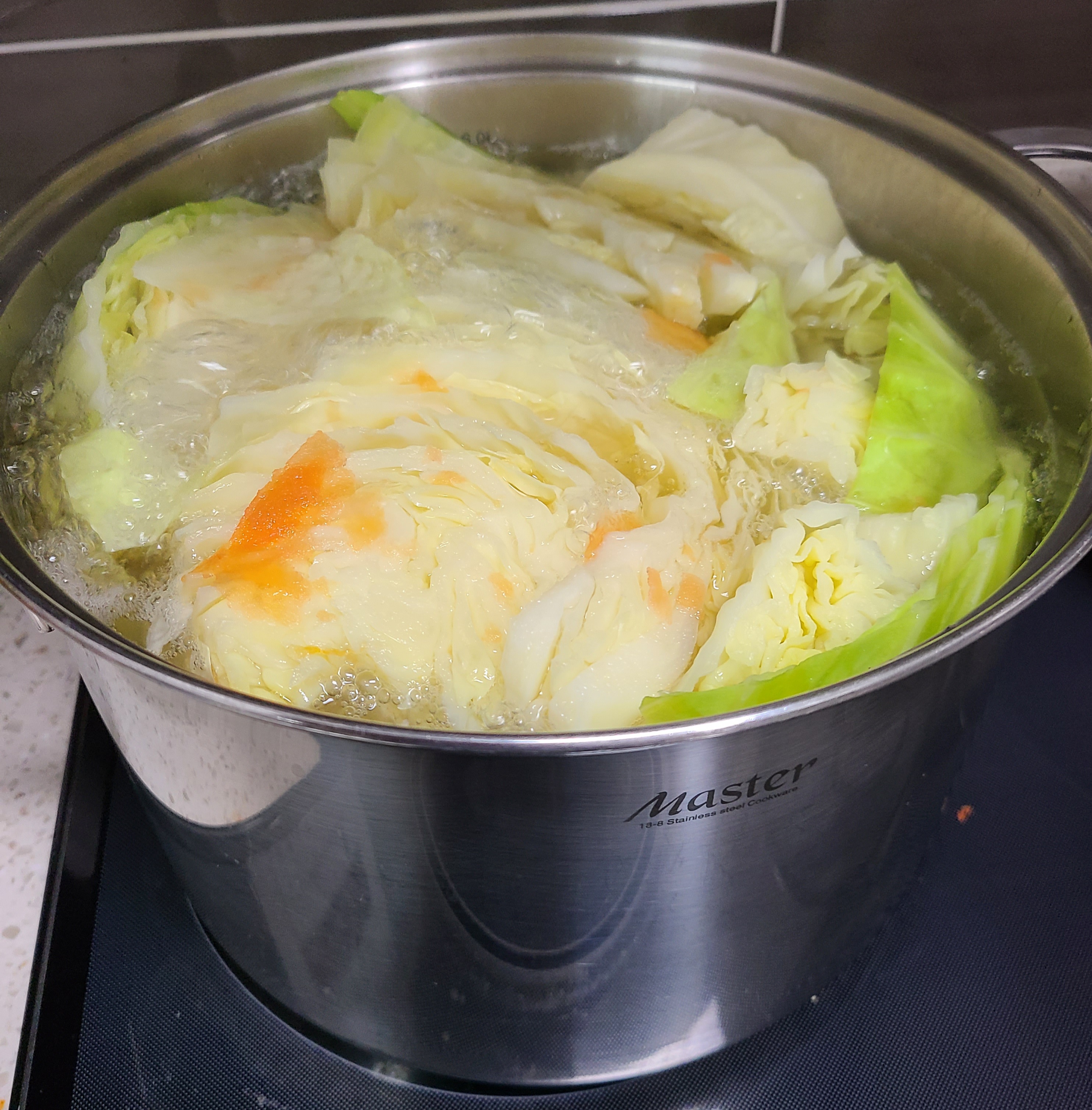 양배추는 큼직하게 썰어 베이킹소다 물에 담가놓았다가 흐르는 물에 씻은 후 삶아낸다.