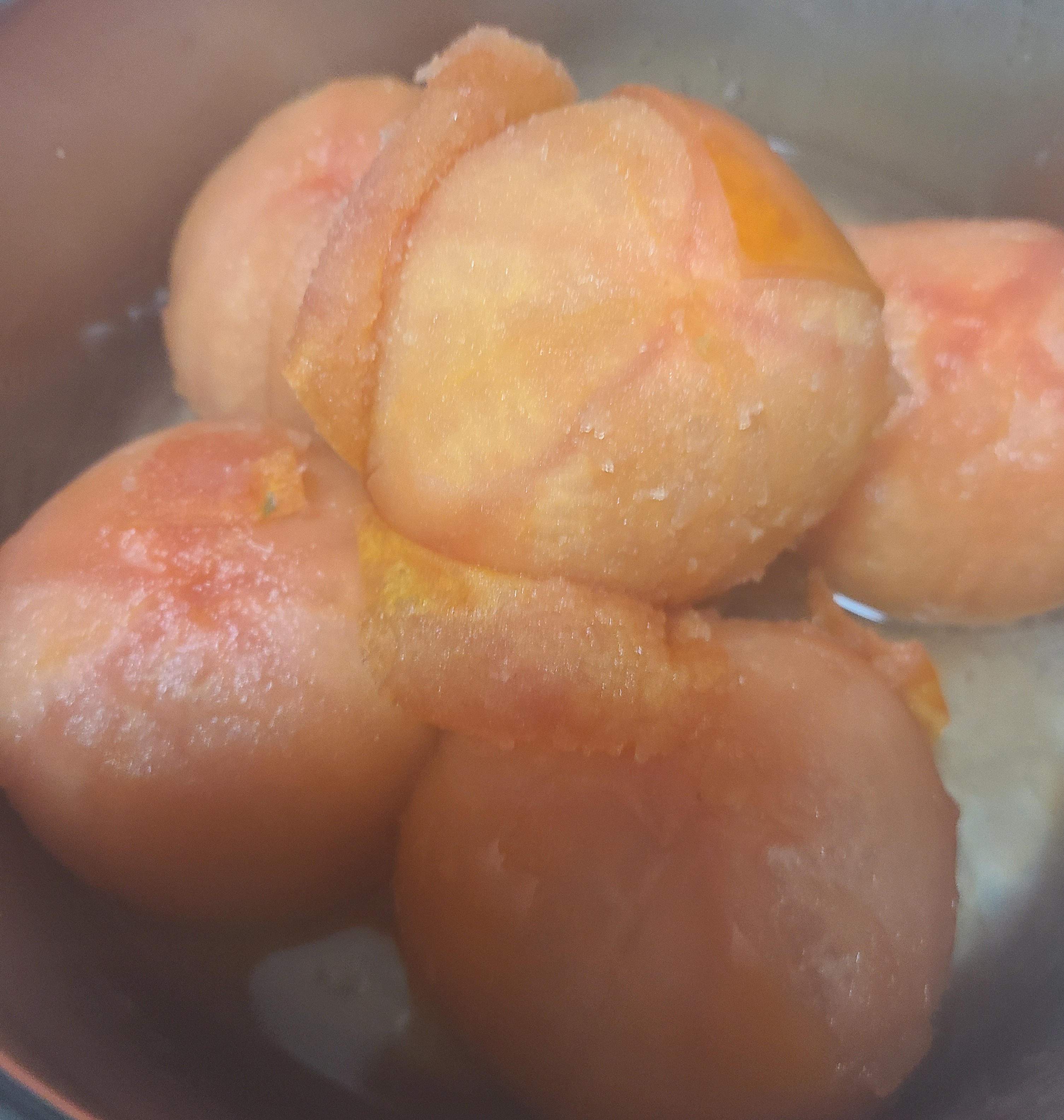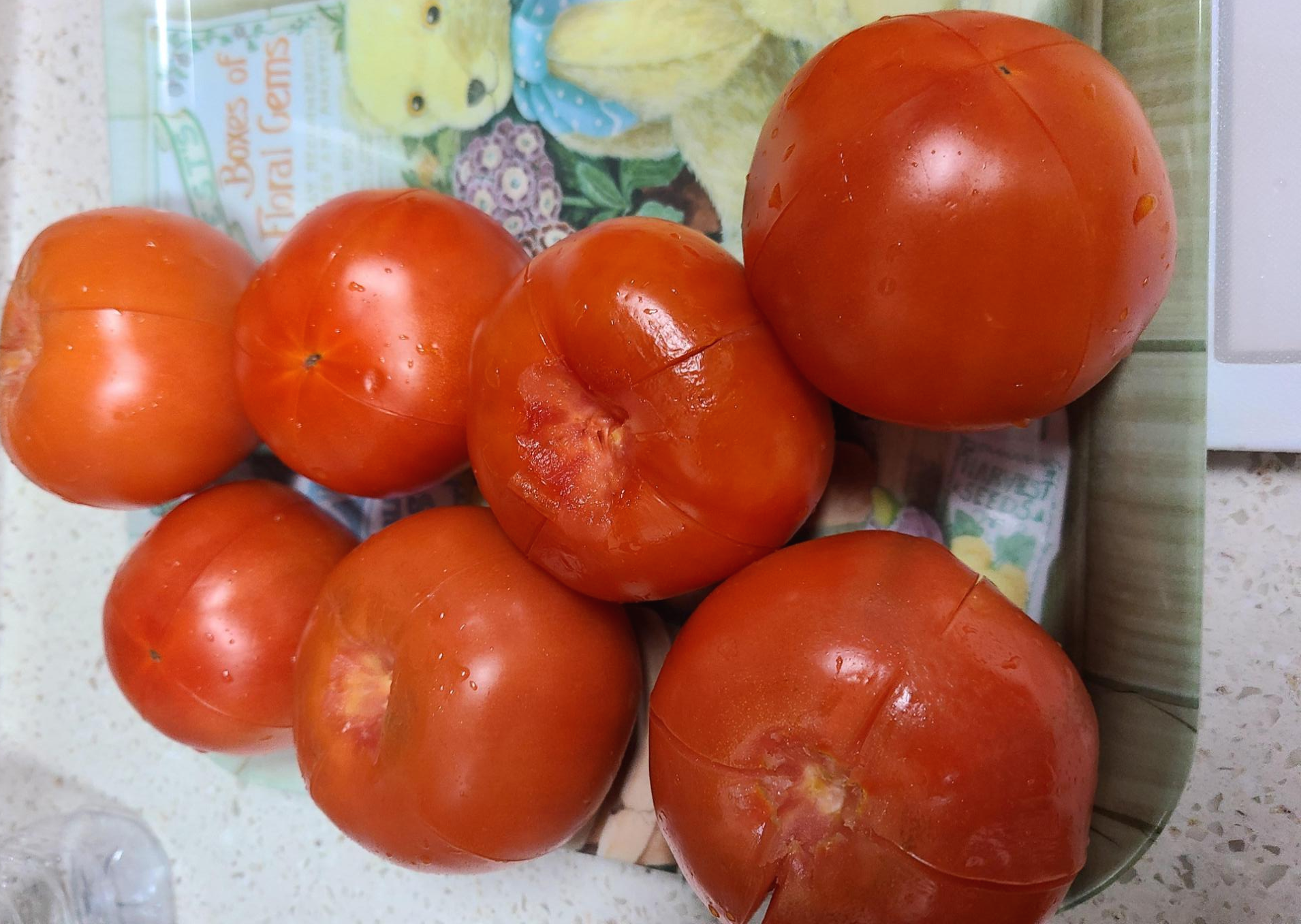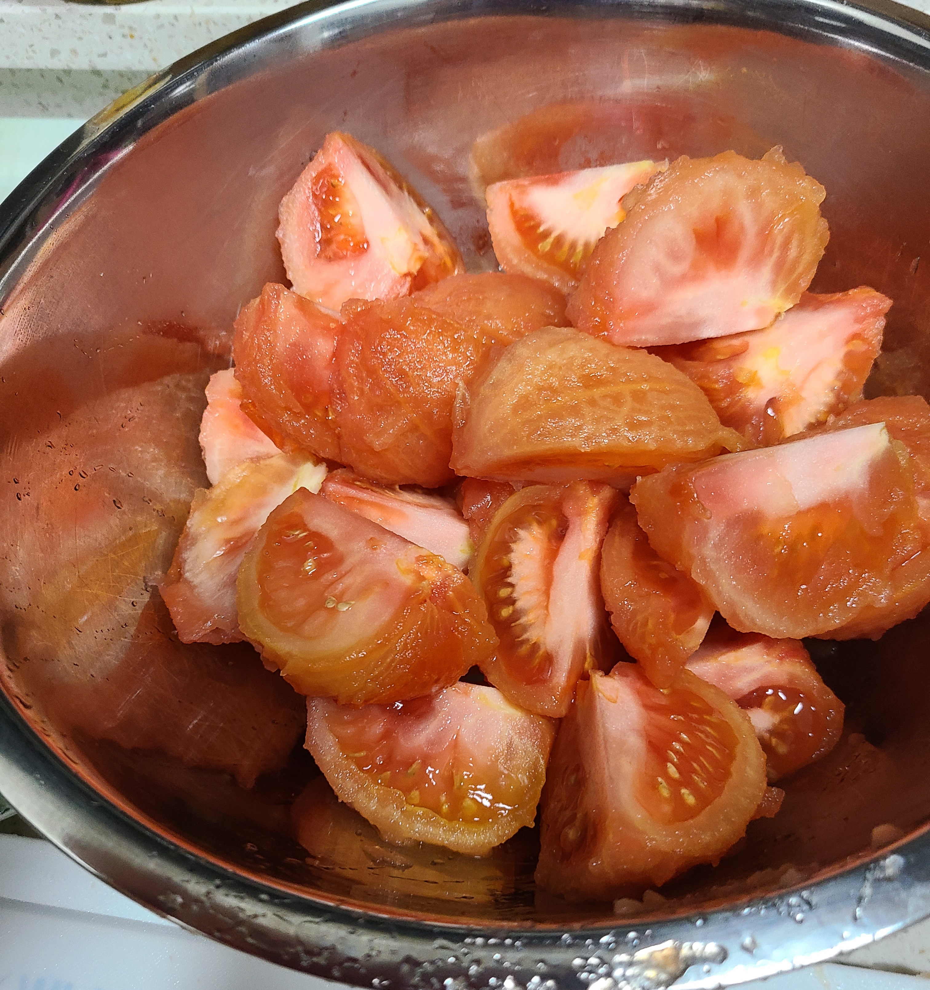 토마토는 열십자로 칼집을 넣은 후 끓는 물에 넣어 껍질이 벗겨지면 건져서 4등분을 낸다.