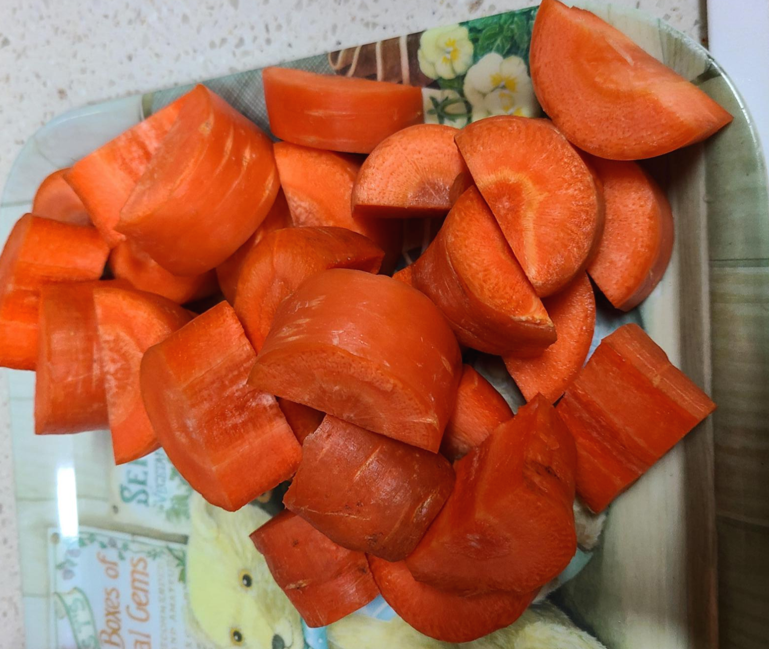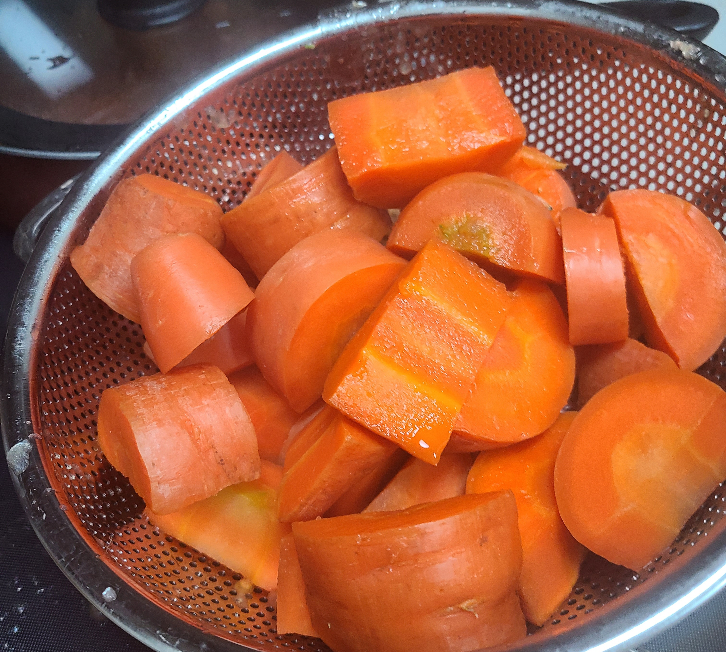 당근은 깨끗이 씻고 껍질은 굳이 벗기지 않아도 된다.등분을 나누어 썰은 후 삶아낸다.