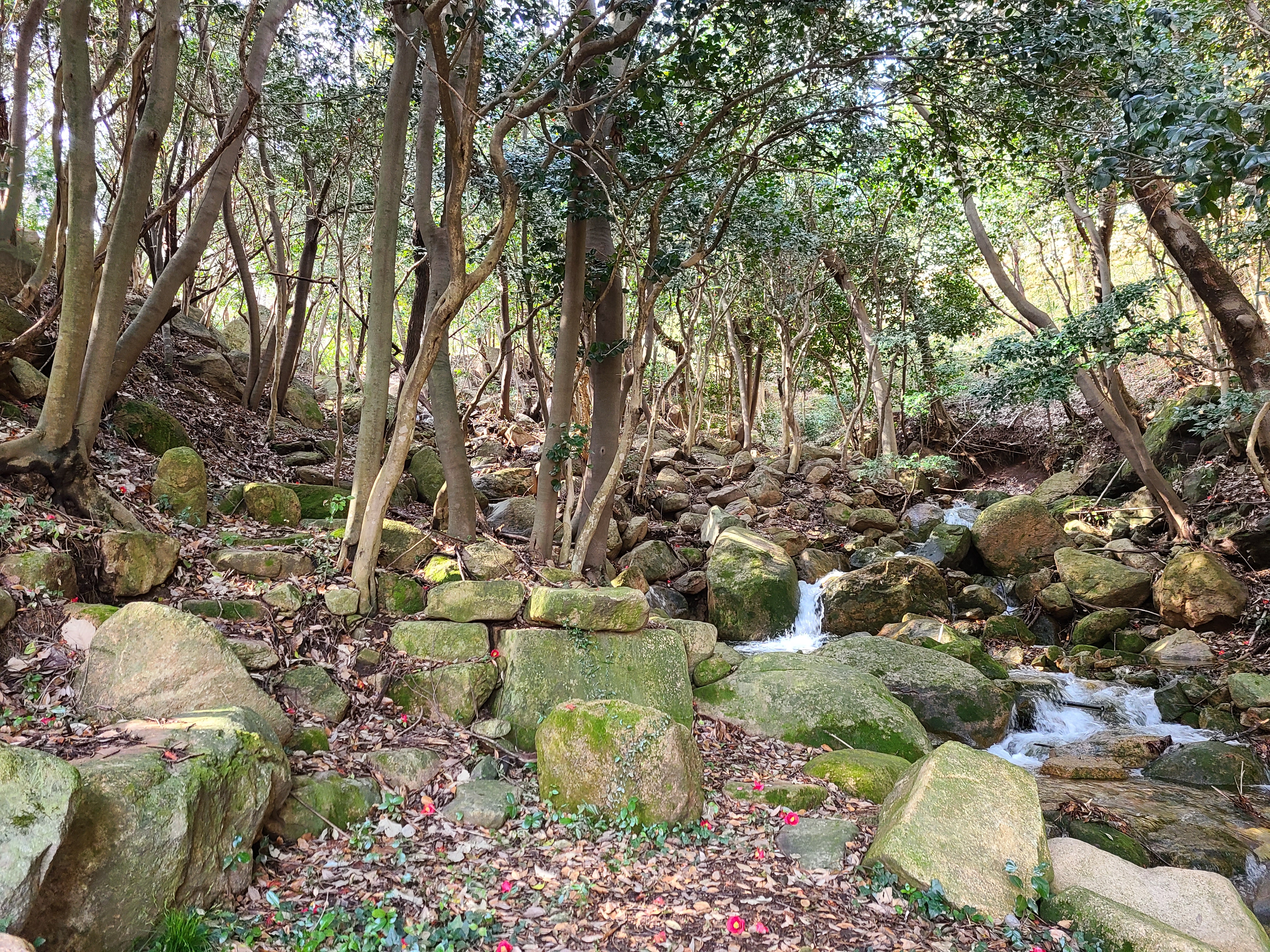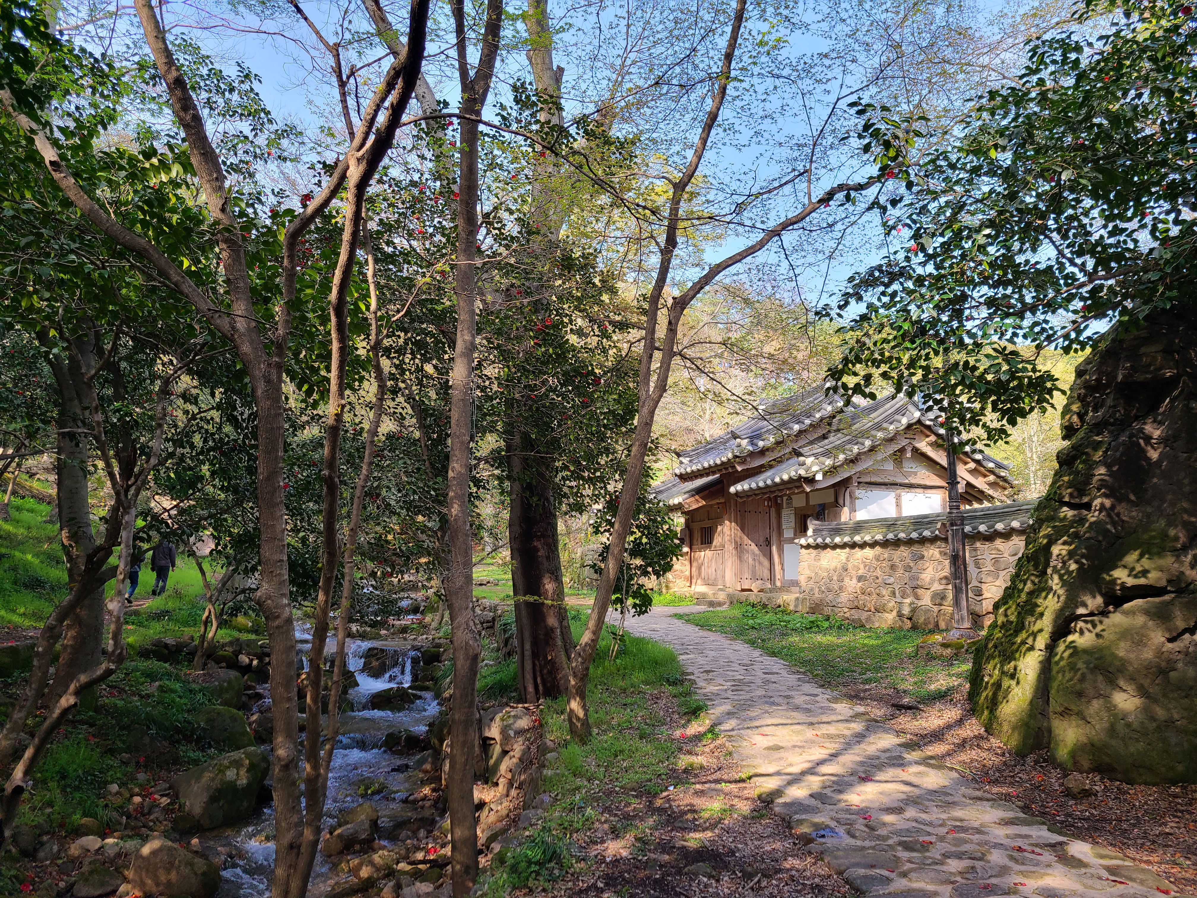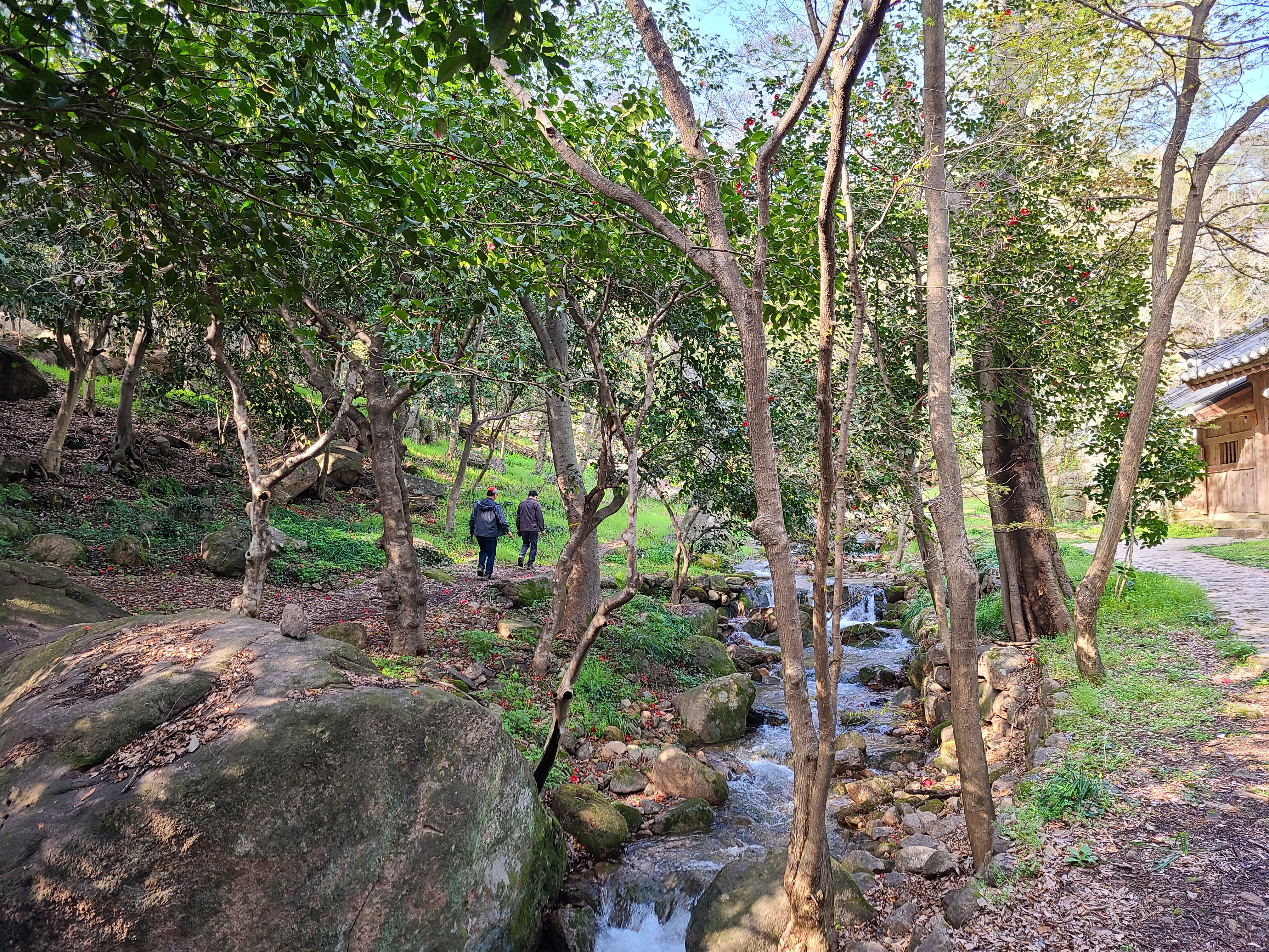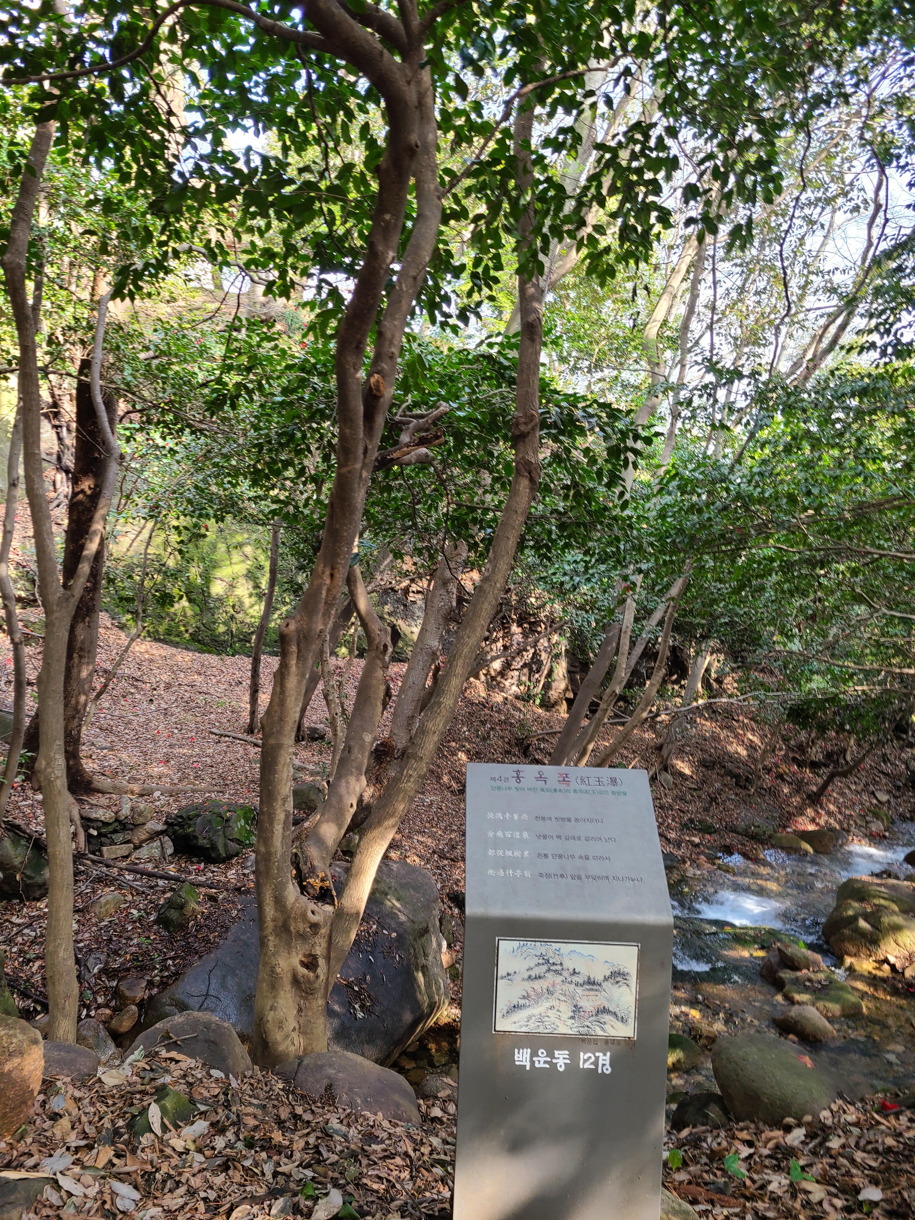 백운동 원림에는 울창한 원시림이 잘 보존되어있다. 동백꽃이 숲길에 떨어져 있어 발에 밟힐까 봐 꽃을 피해 천천히 걸어본다.