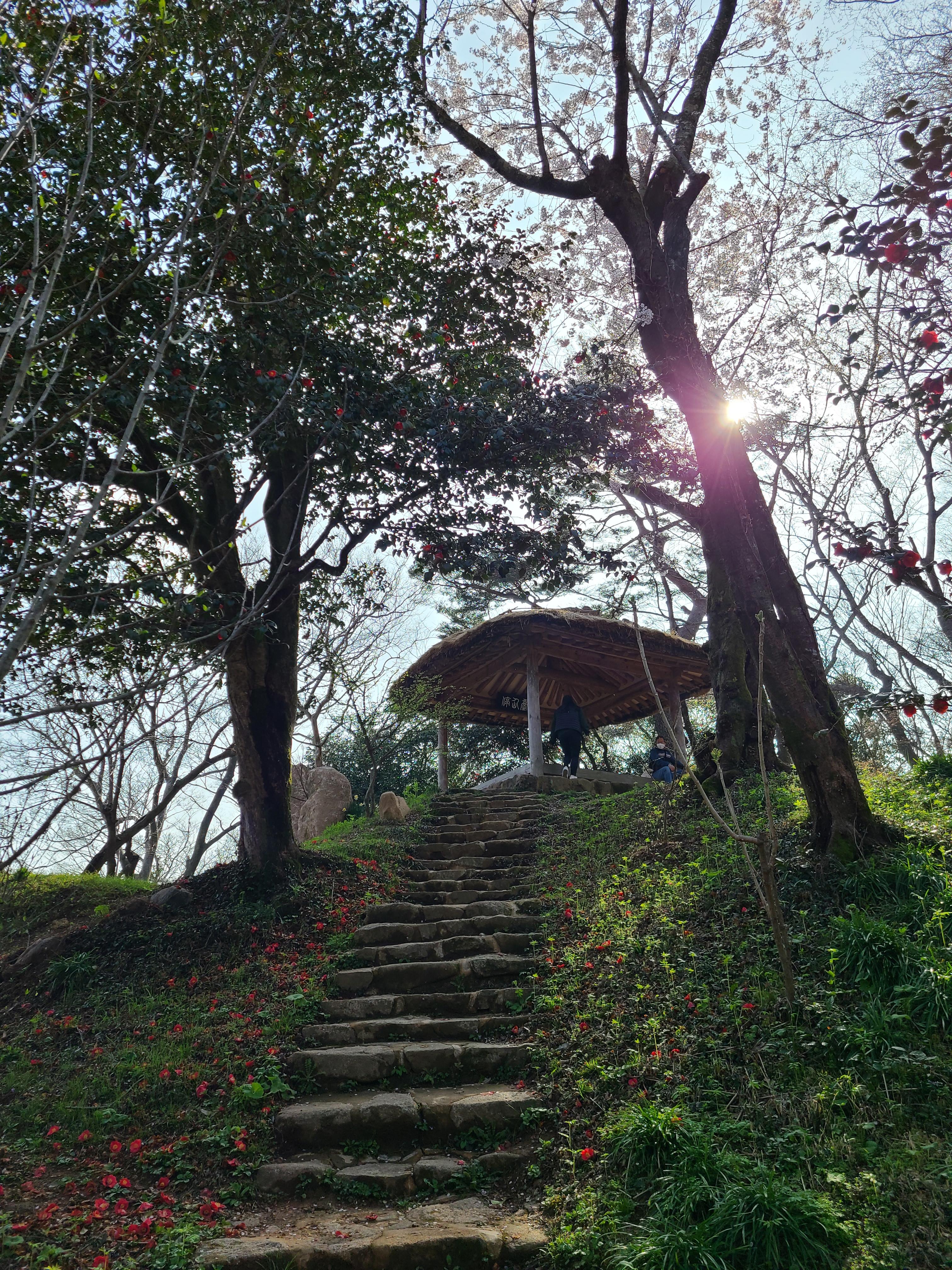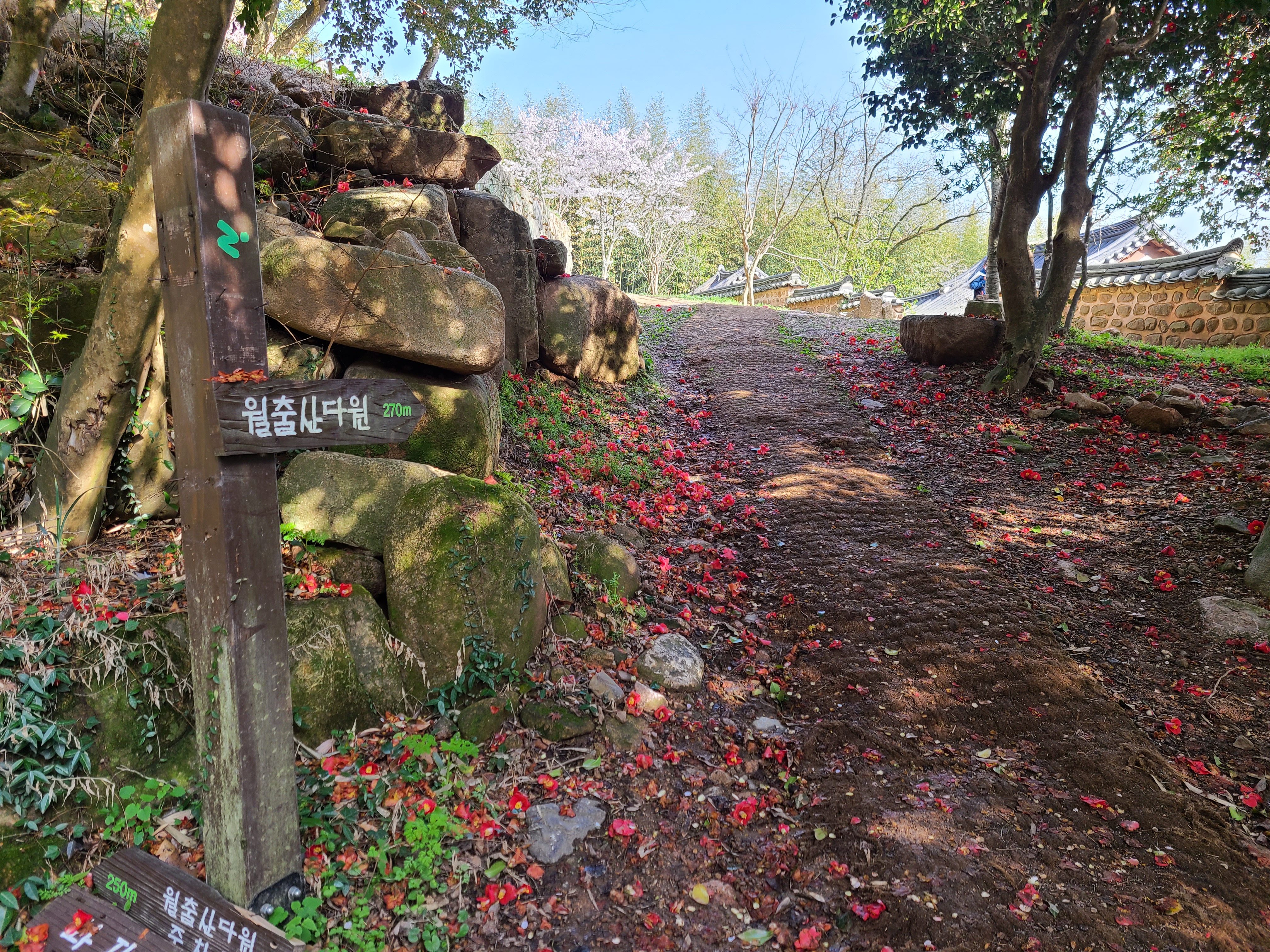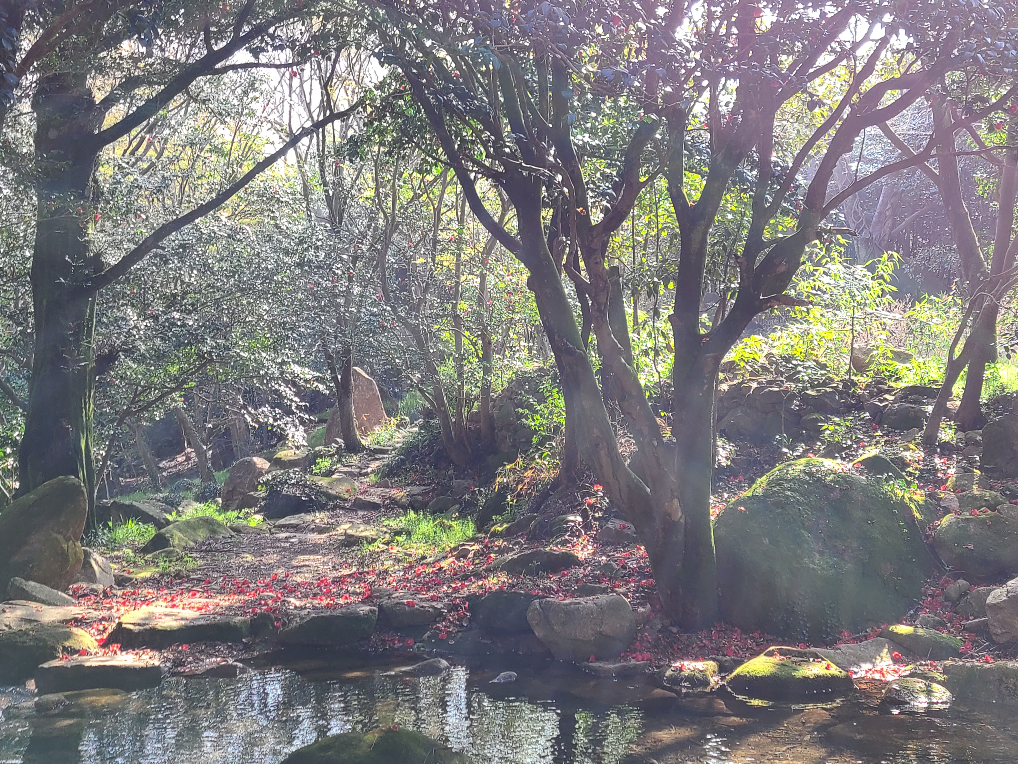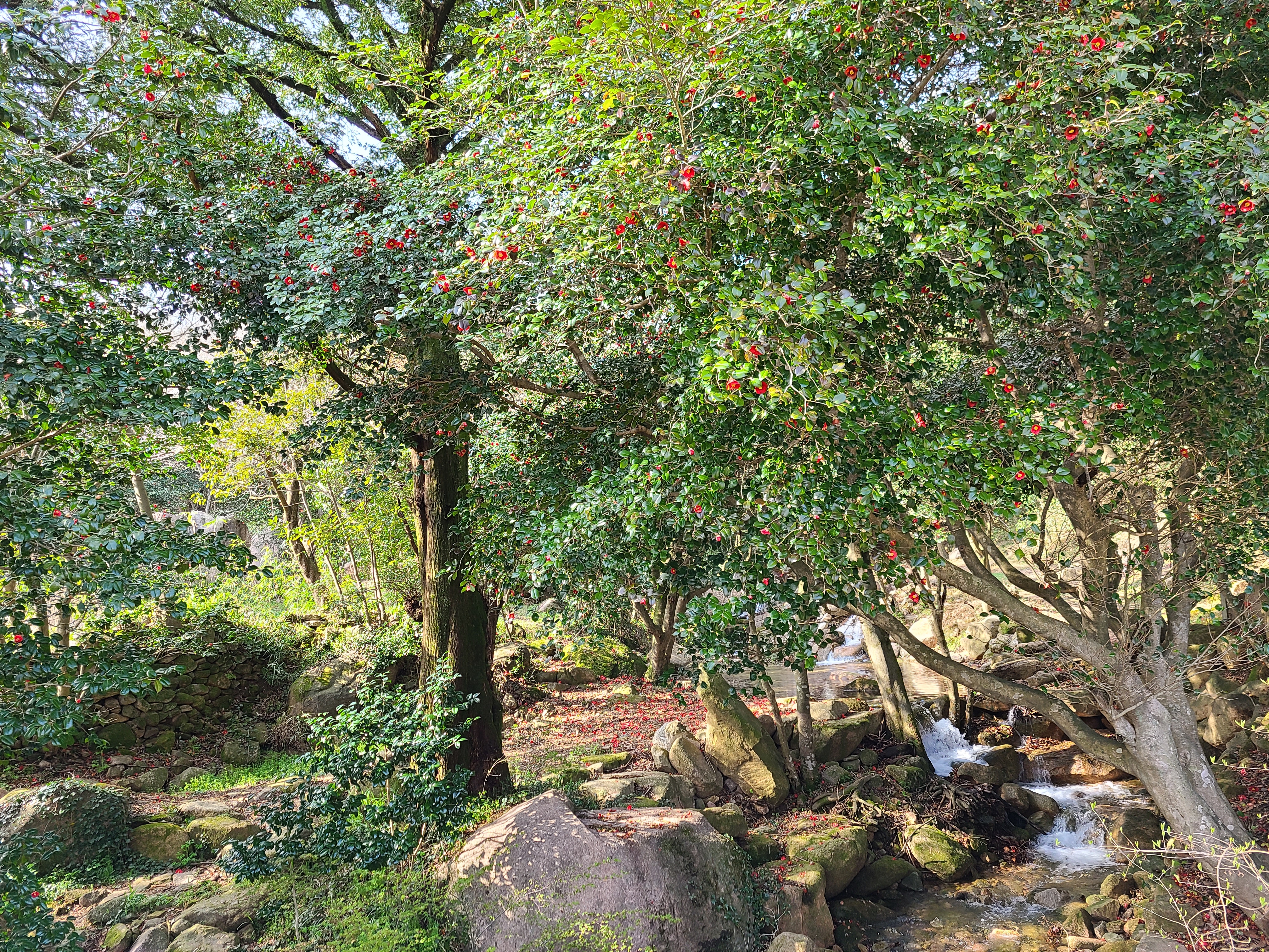 백운동 원림에는 울창한 원시림이 잘 보존되어있다. 동백꽃이 숲길에 떨어져 있어 발에 밟힐까 봐 꽃을 피해 천천히 걸어본다.