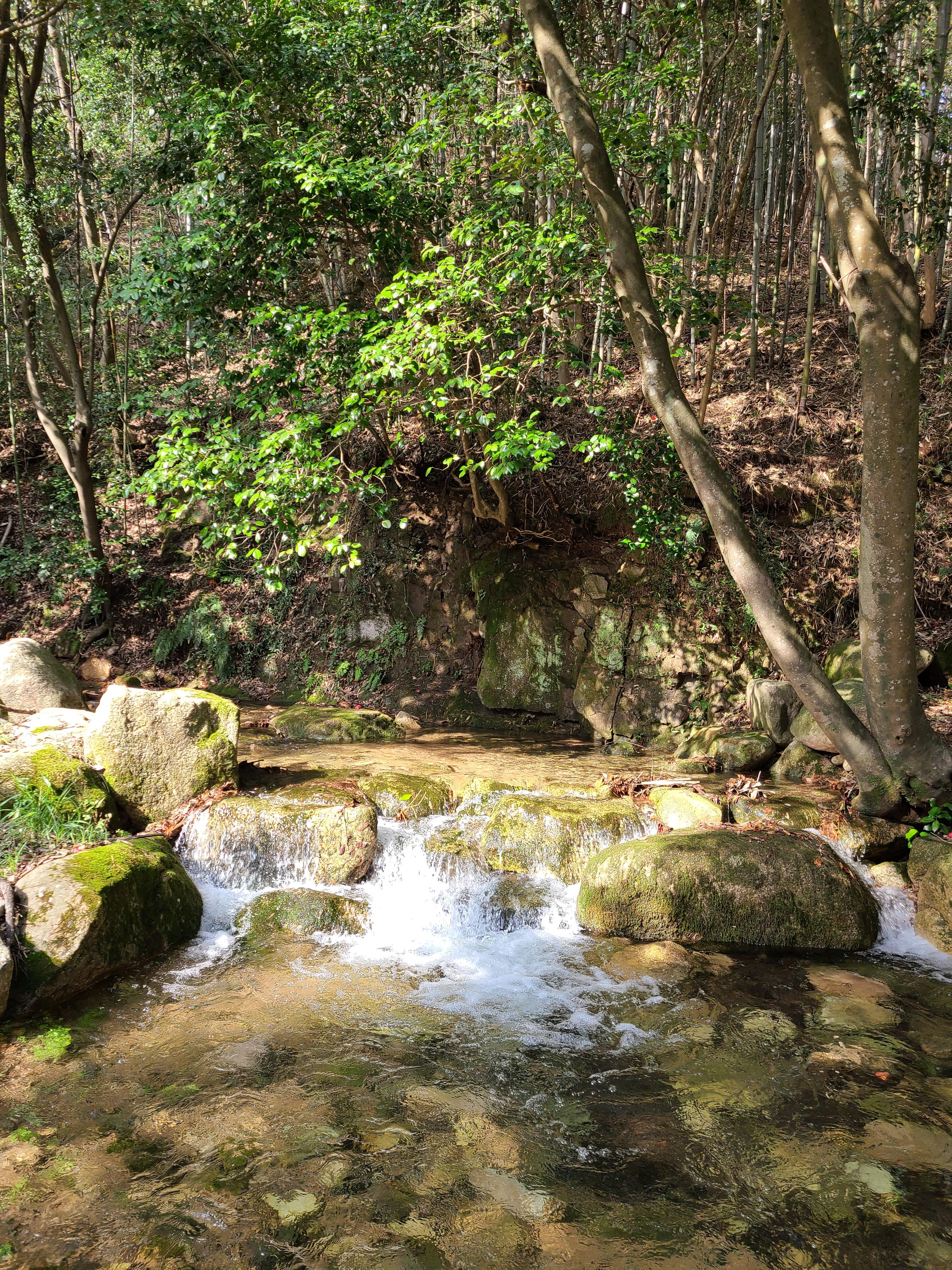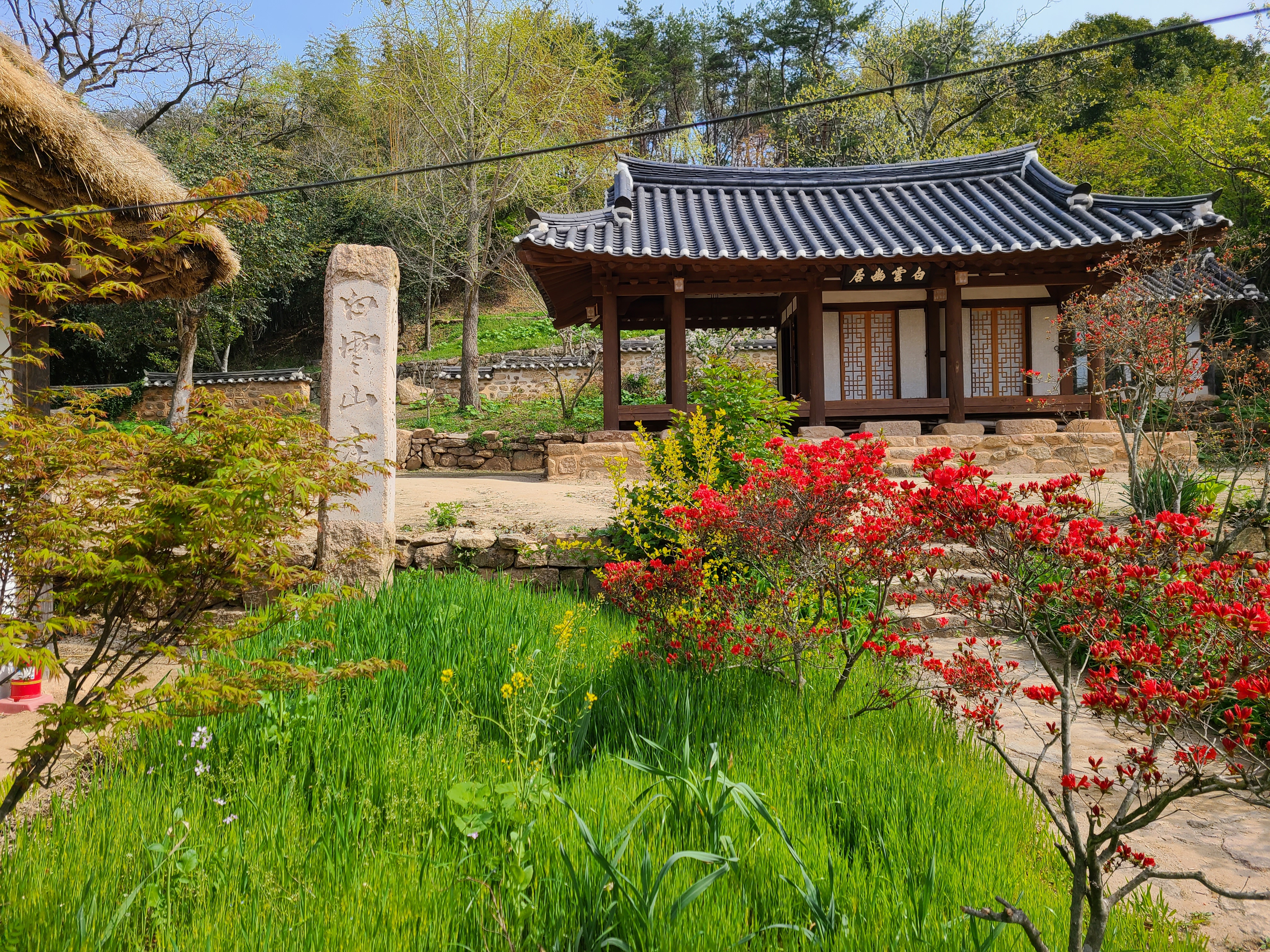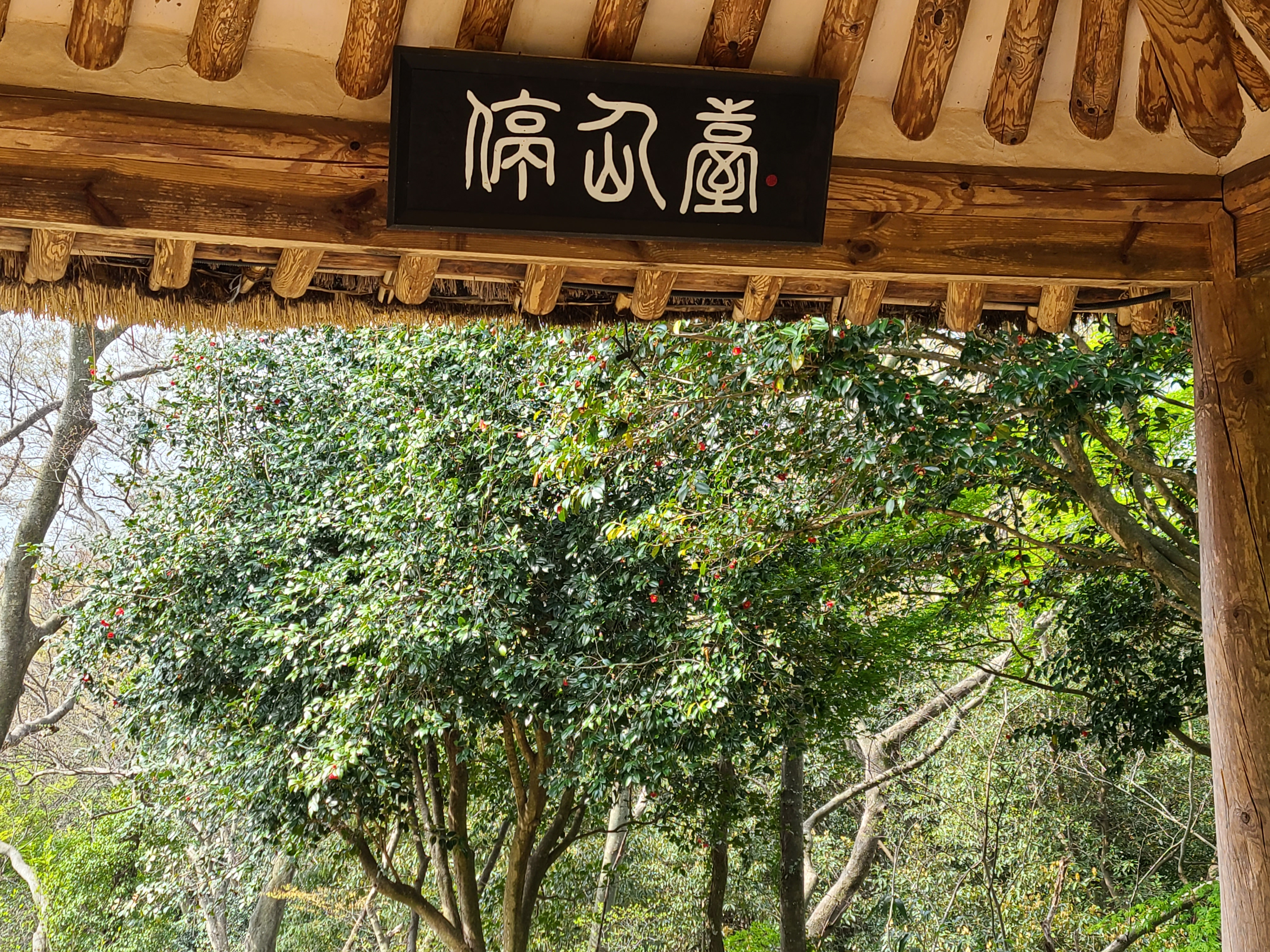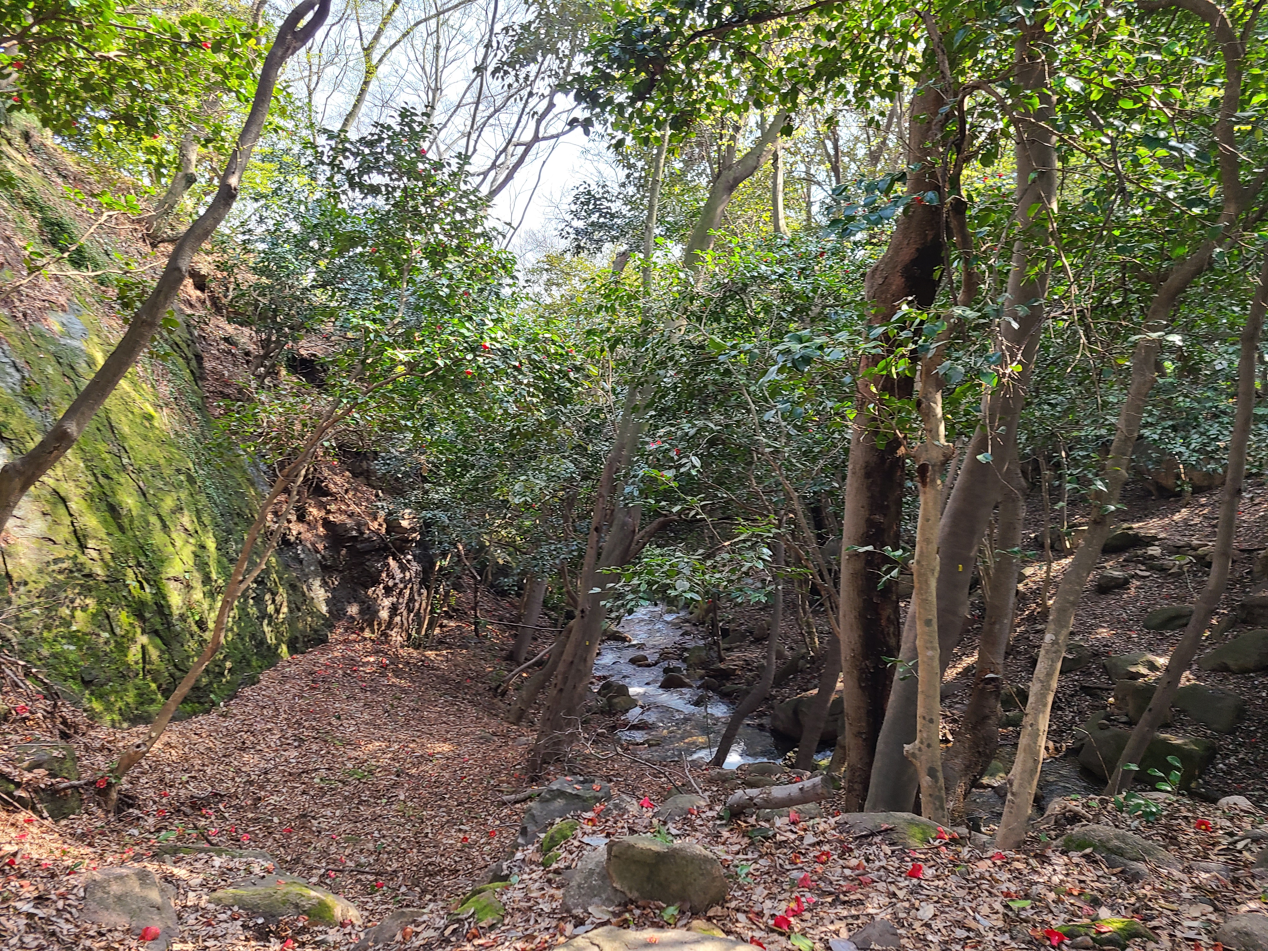 백운동 원림에는 울창한 원시림이 잘 보존되어있다. 동백꽃이 숲길에 떨어져 있어 발에 밟힐까 봐 꽃을 피해 천천히 걸어본다.