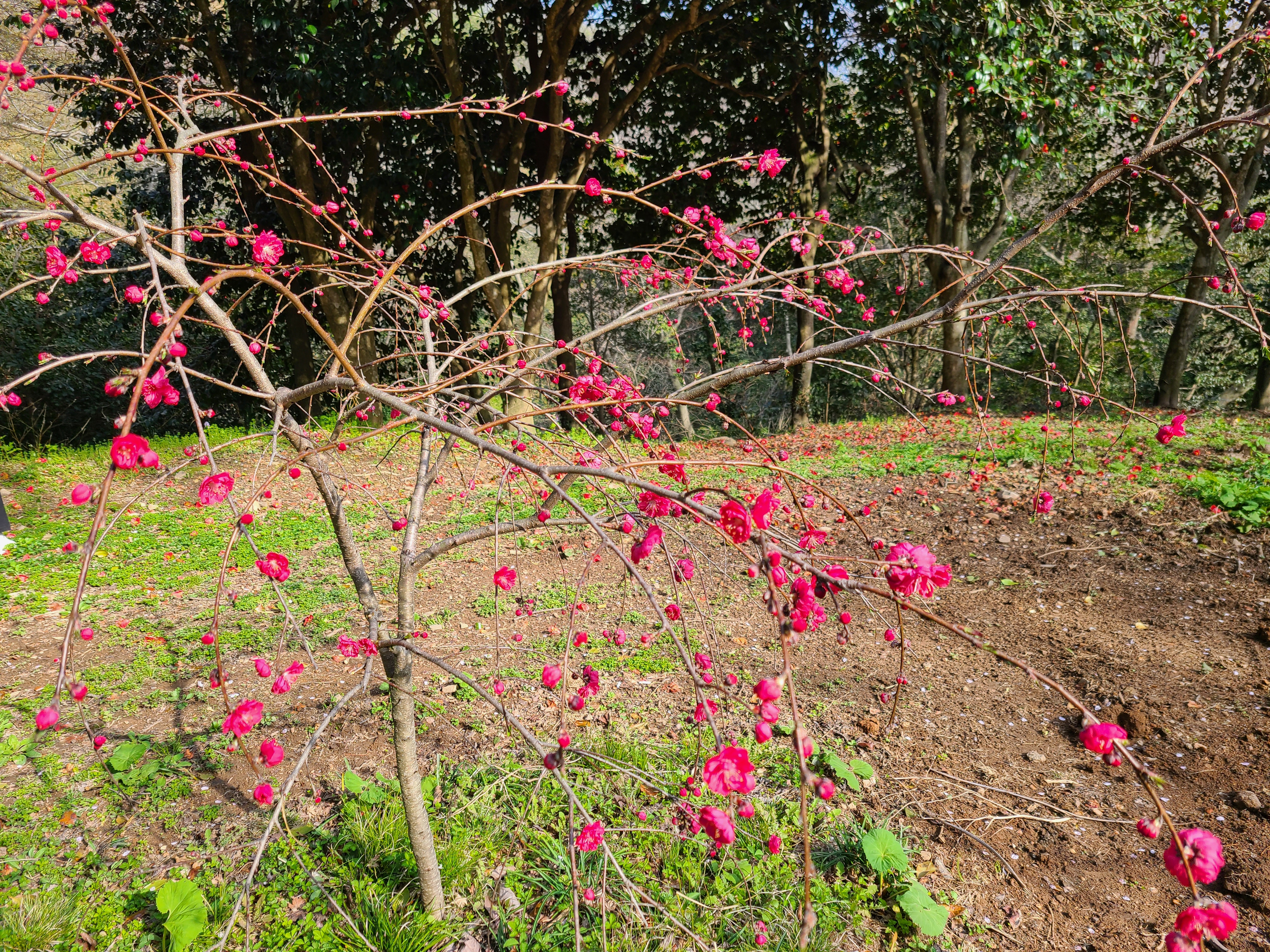 정선대에서 오른쪽으로 눈을 돌리면 동백나무 아래 홍매화가 빨갛게 피여 나는 모습이 보인다.
