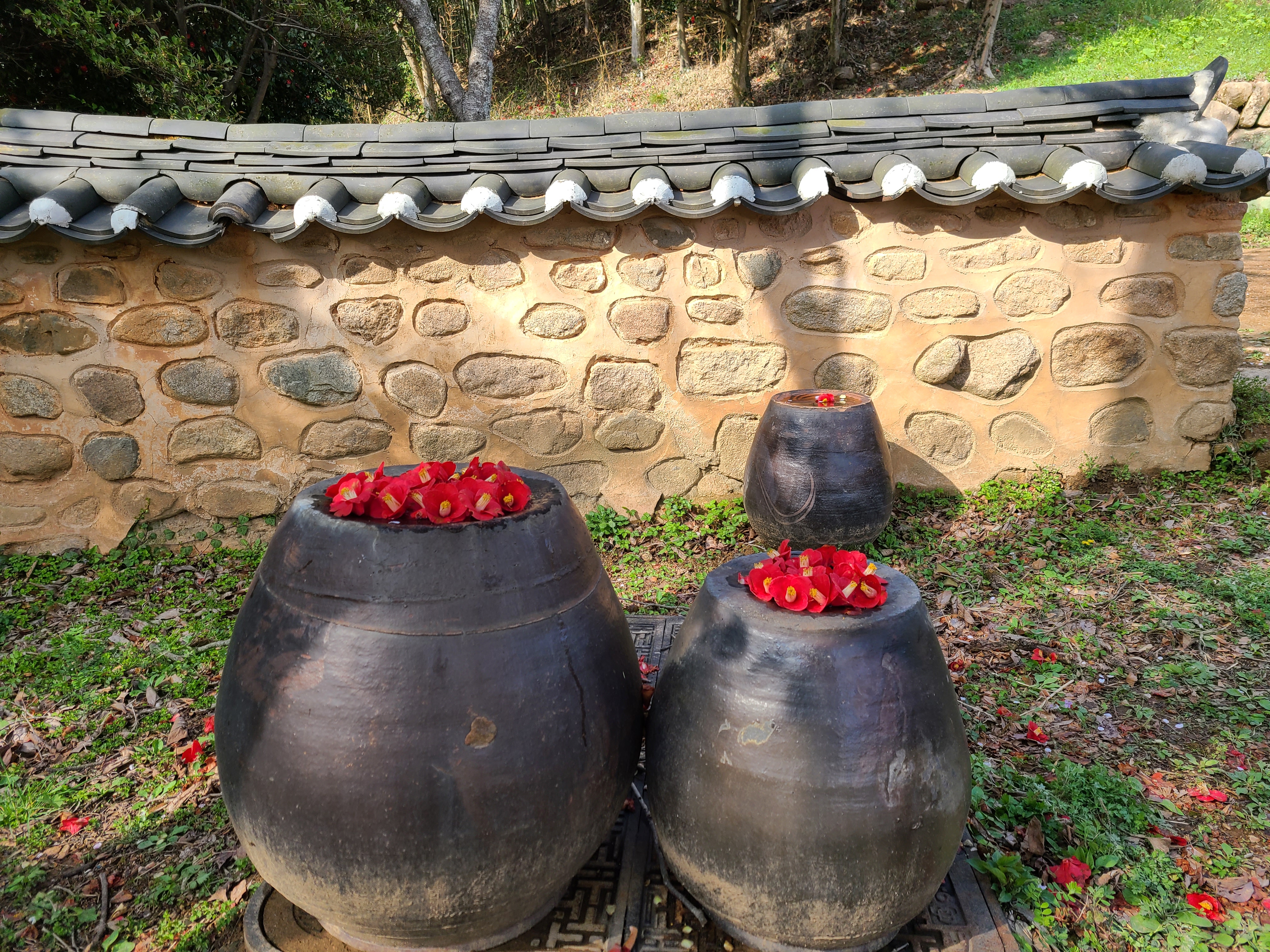 담 사이로 난 입구로 들어서니 동백나무 아래 떨어져 있는 동백꽃을 누군가가 항아리 위에 올려놓았다.