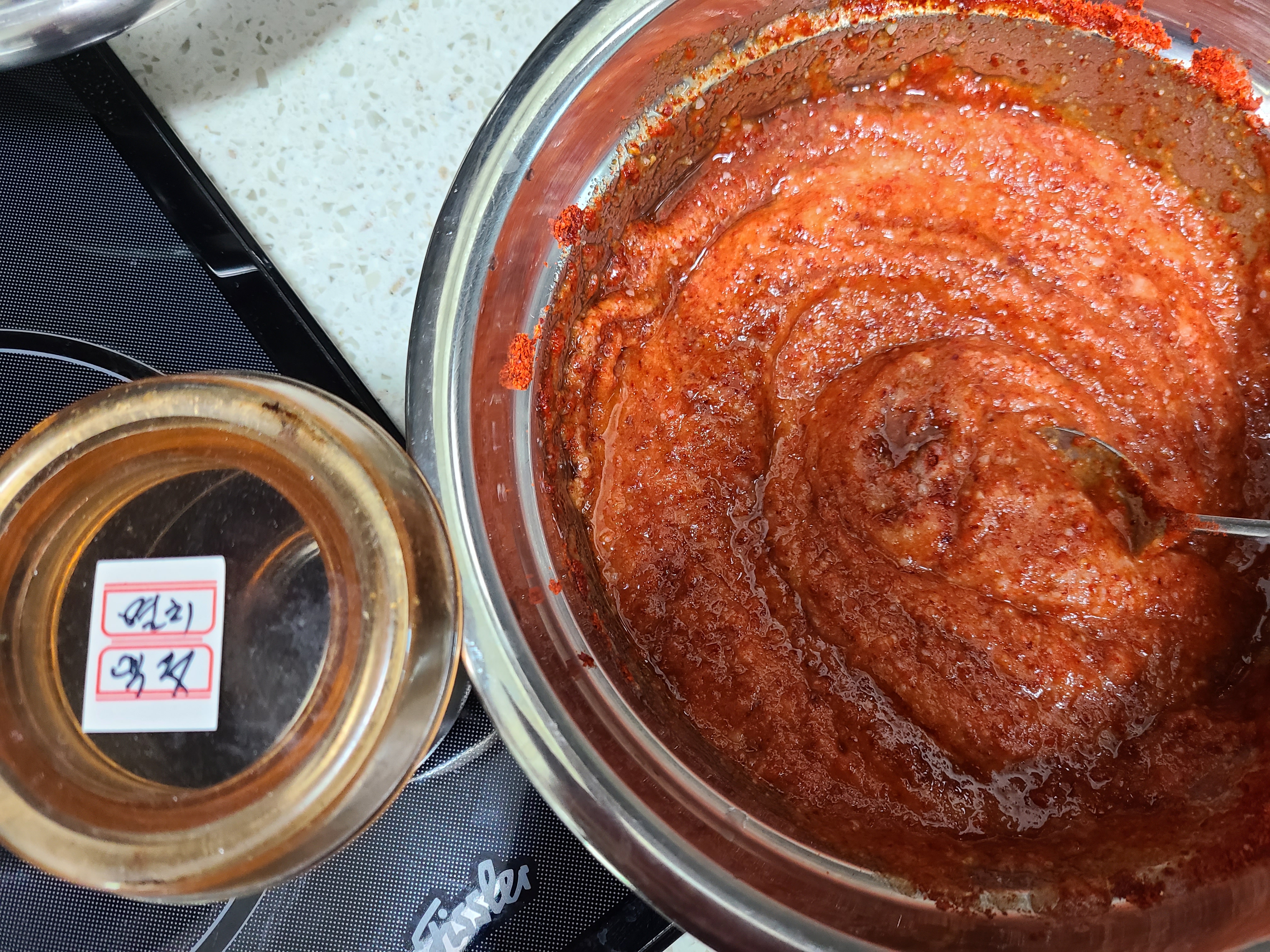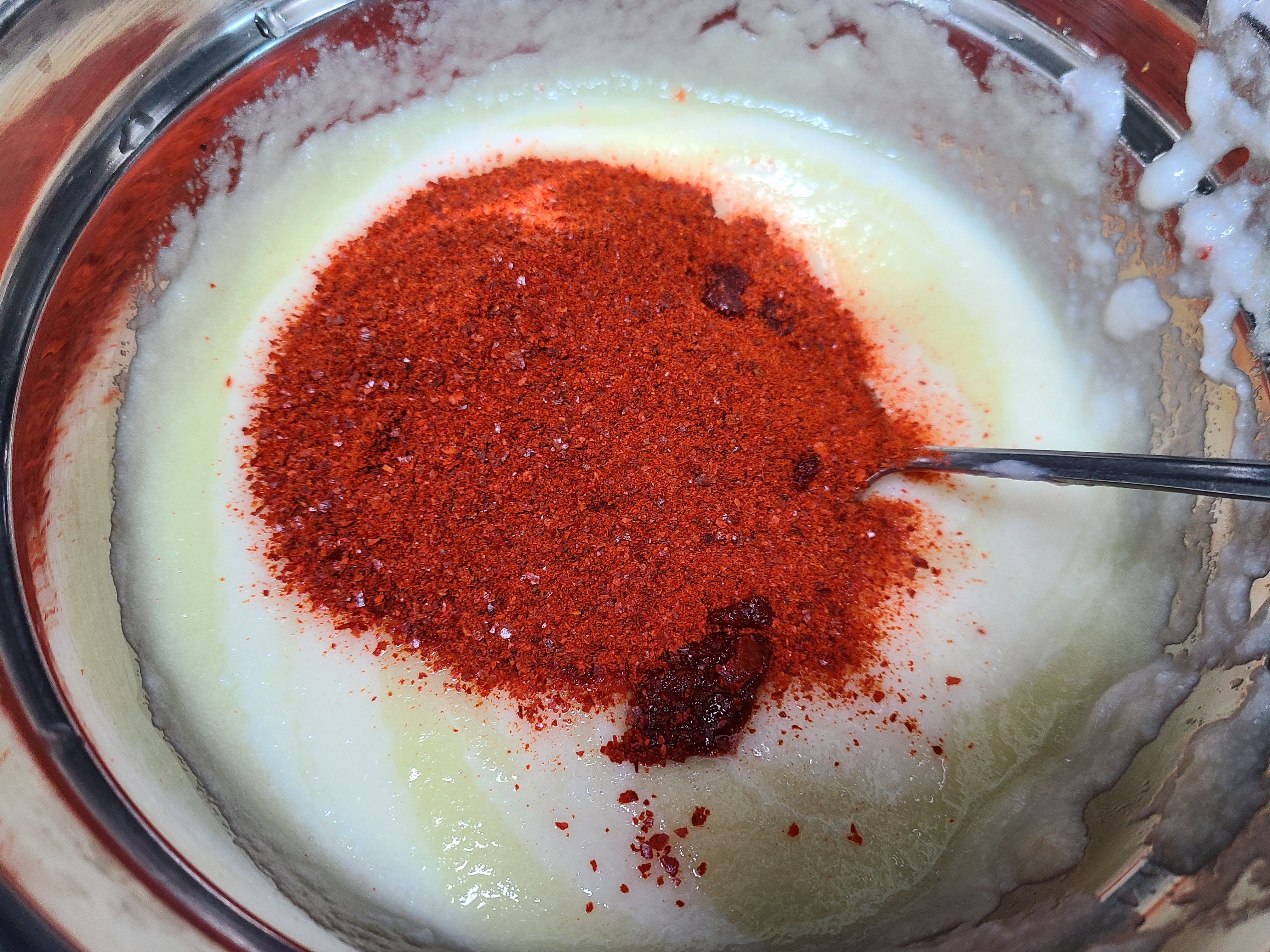 양념에 고춧가루 300ml를 넣어 섞어준다.