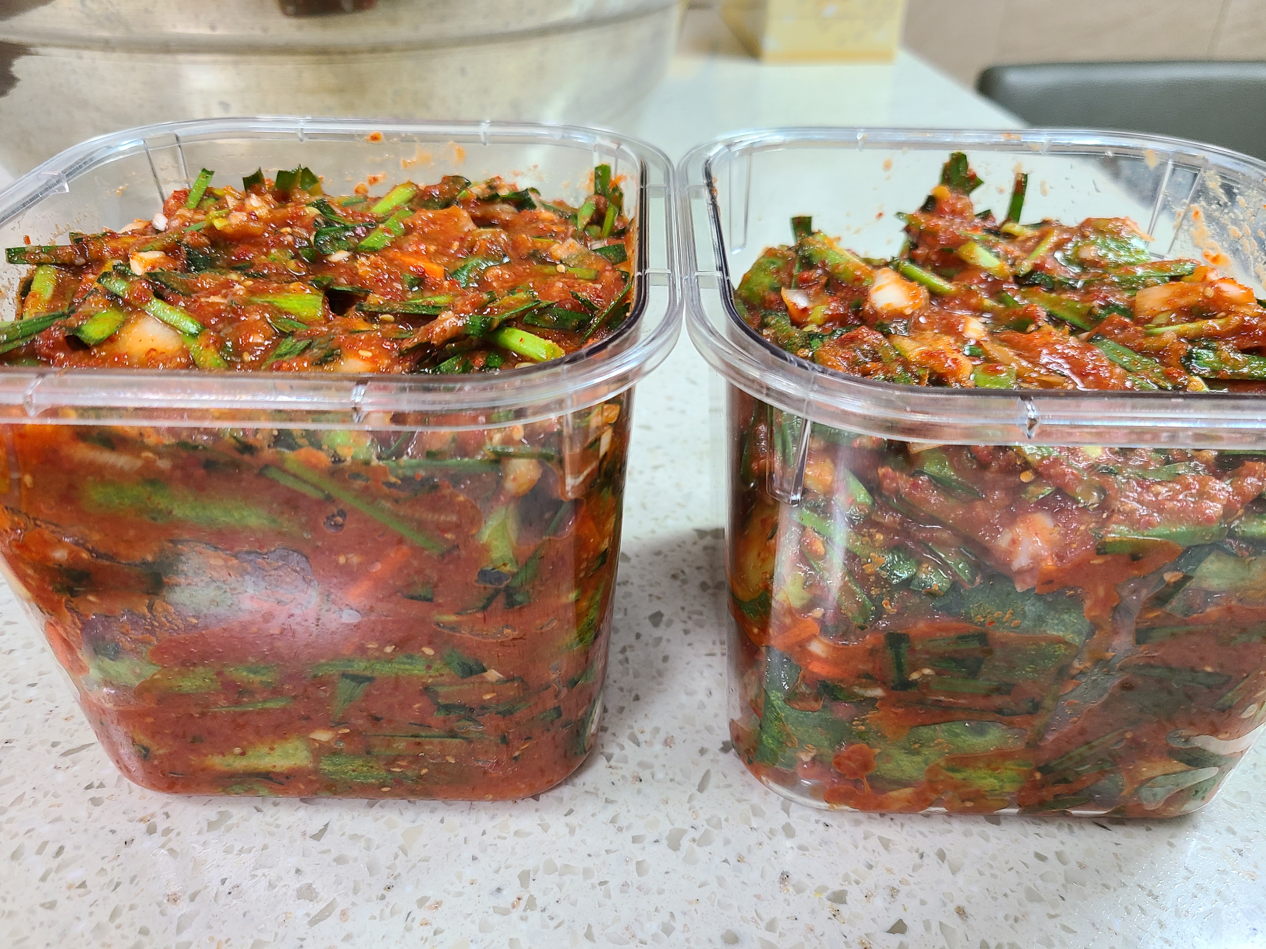 딸을 나눠주려도 두 개의 통에 나누어 담았다. 남은 양념소를 위에 덮어준다.