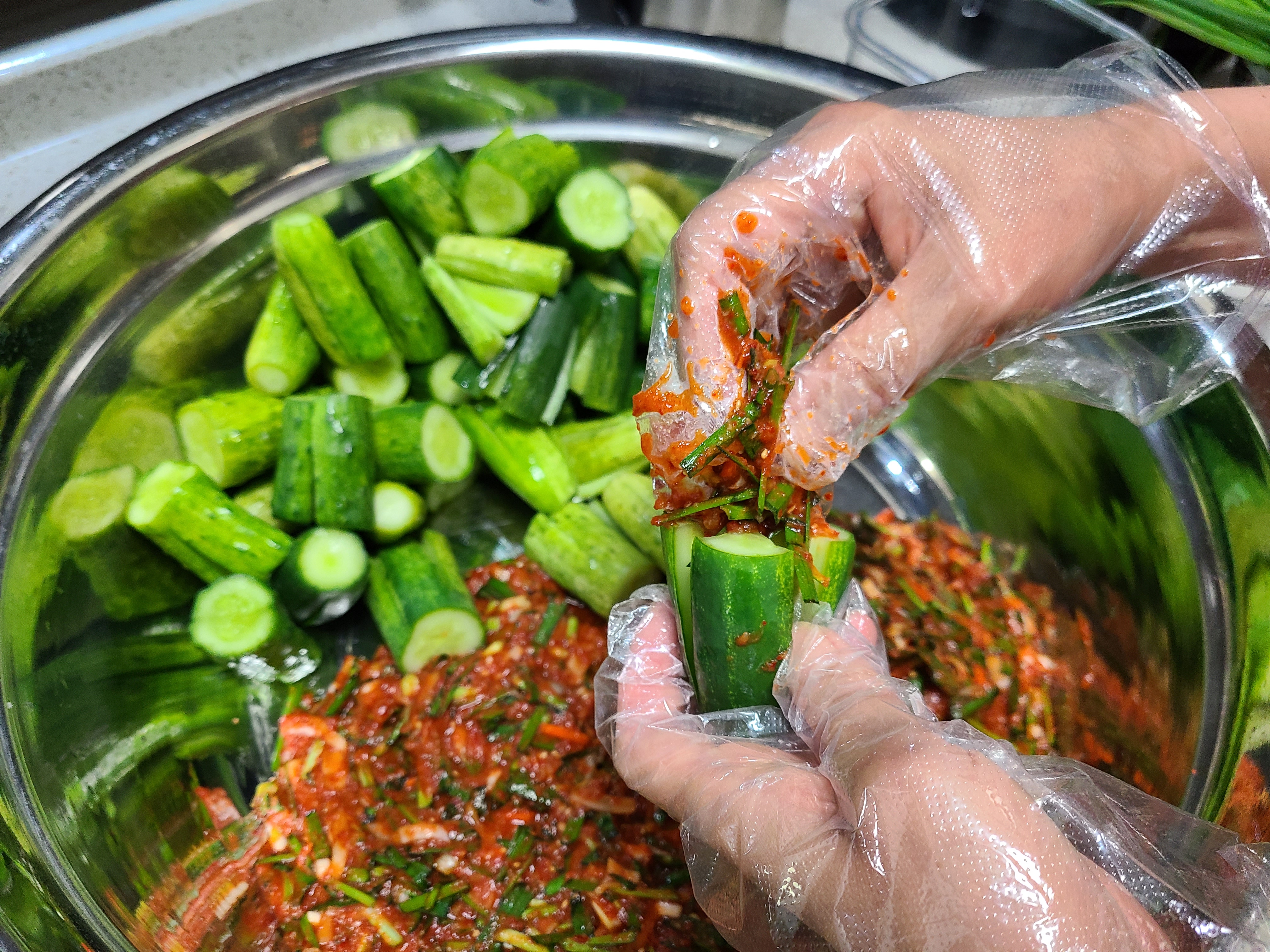 오이에 열십(十) 자로 칼집에 넣어준 곳에 양념을 넣어준다.