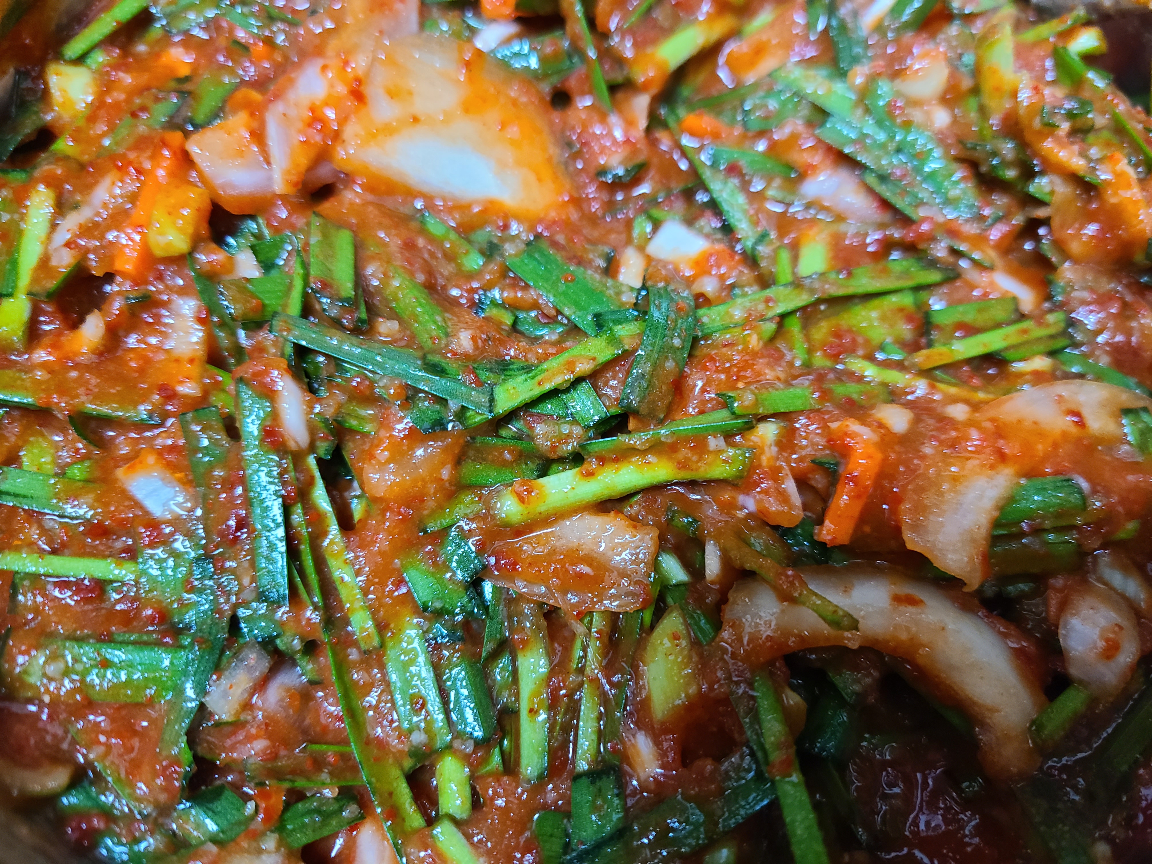 재료: 부추 한 줌, 당근 1/3개, 양파 1개, 대파 흰 부분 한뿌리, 마늘 한 컵, 생강 약간, 밥 1/2 공기, 새우젓 2큰술, 멸치액젓 3큰술, 생수 100ml, 매실청 2큰술, 설탕 1큰술, 고춧가루 300ml