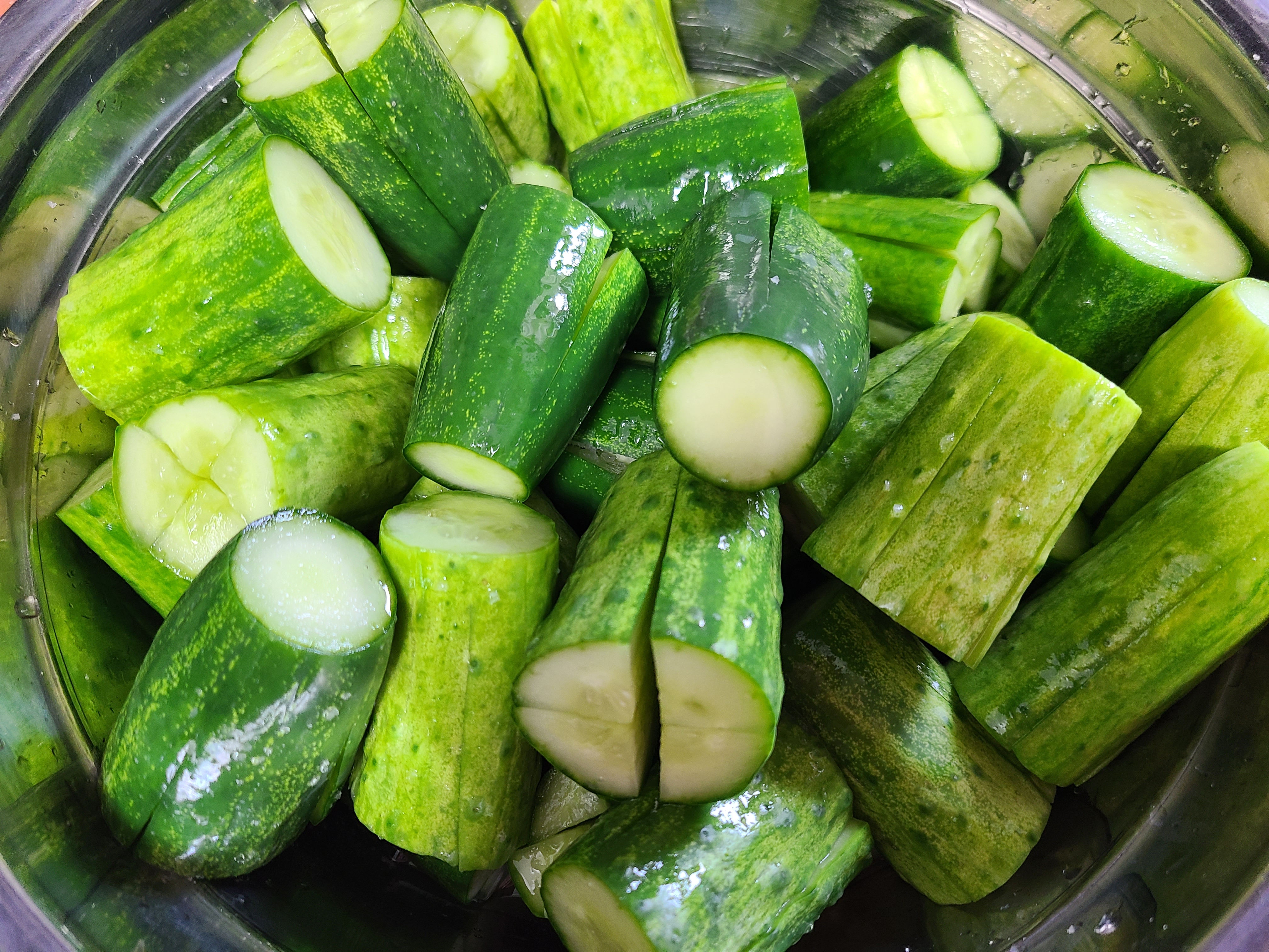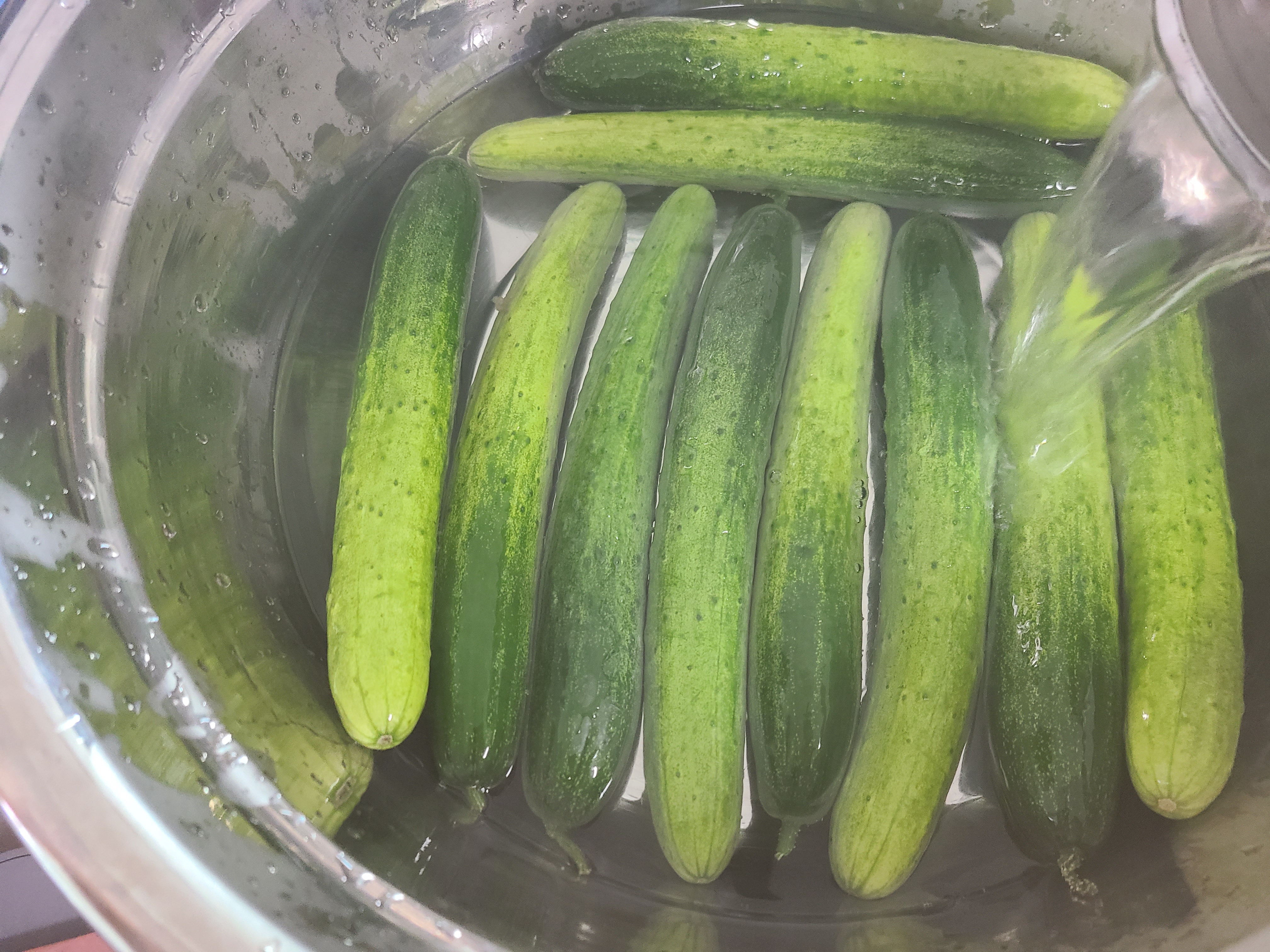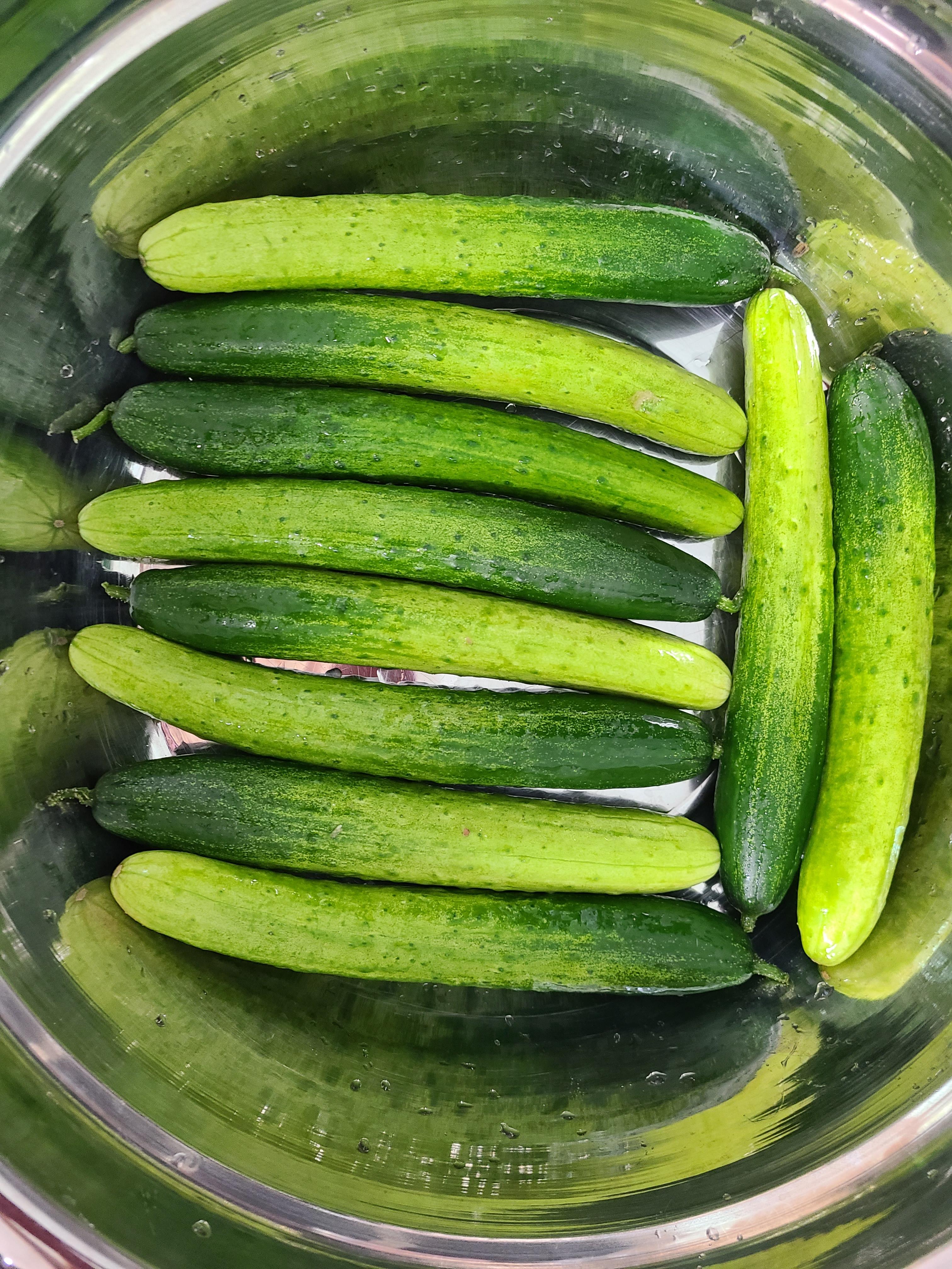 베이킹소다로 오이 겉면을 문질러 준 후 오이를 물에 깨끗이 씻어준다 스테인리스 그릇에 오이를 가지런히 담아준다.