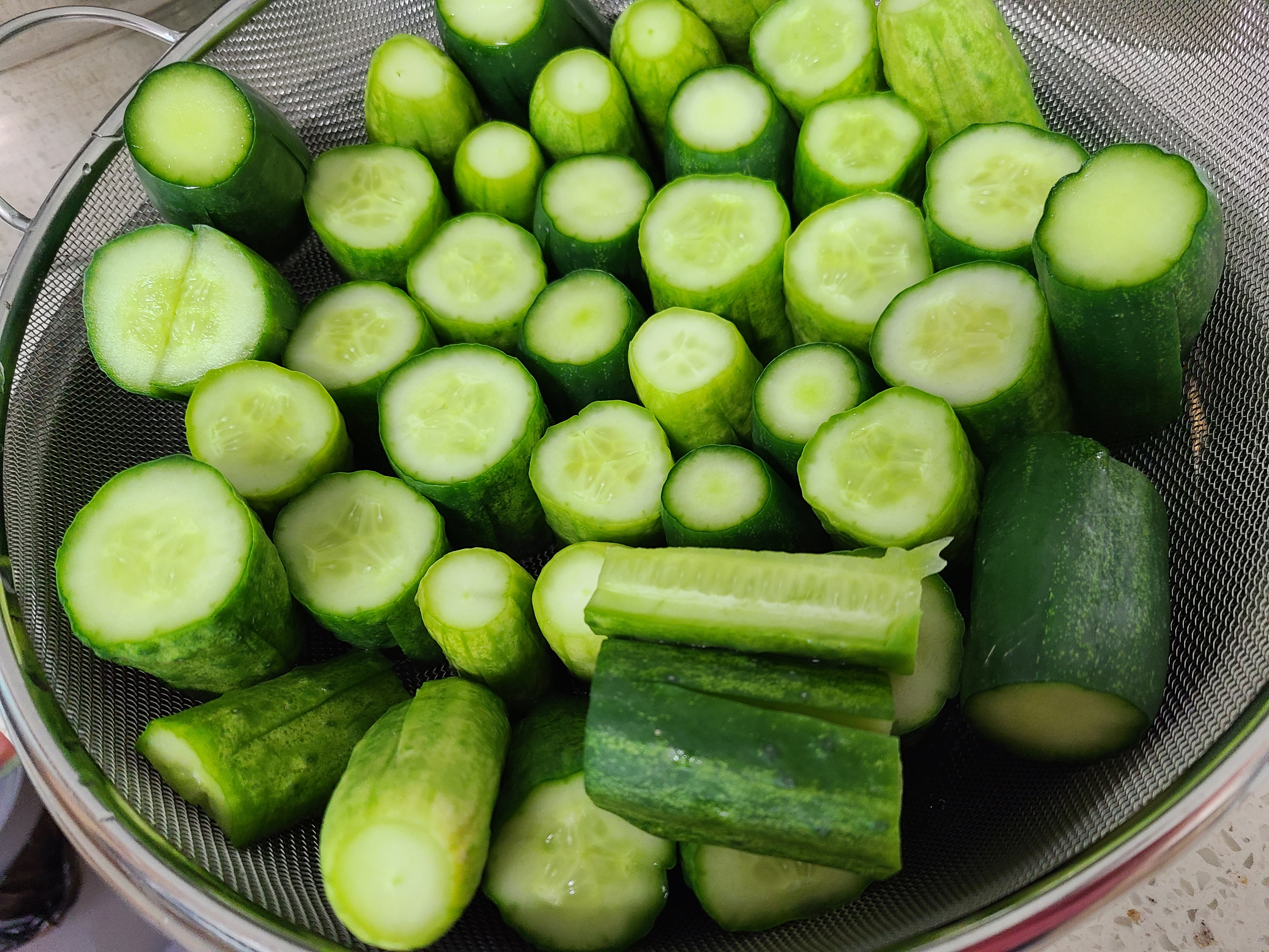 절여진 오이를 흐르는 물에 한번 헹구어 준후 물이 빠지기 좋게 칼집을 넣은 쪽을 바닥으로 향하게 체에 담아둔다.