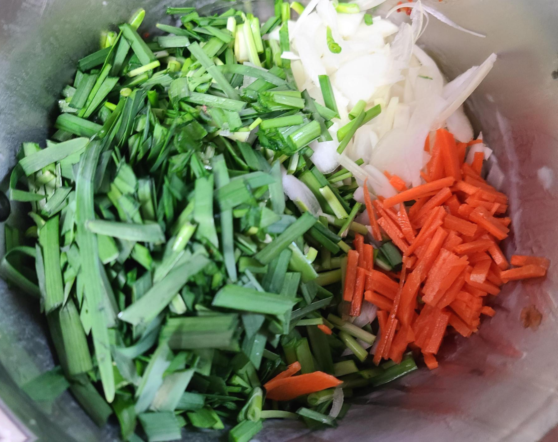 부추, 양파, 당근, 파를 썰어놓은 그릇에 양념장을 부어서 버무려 준다.